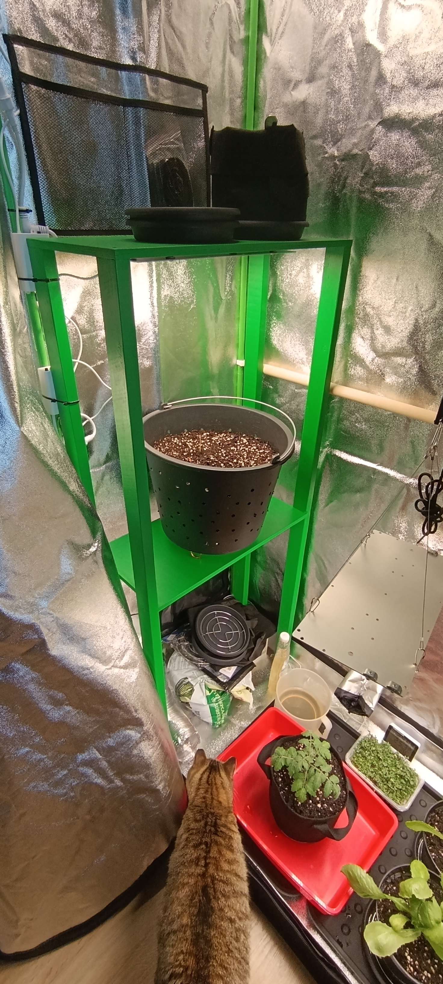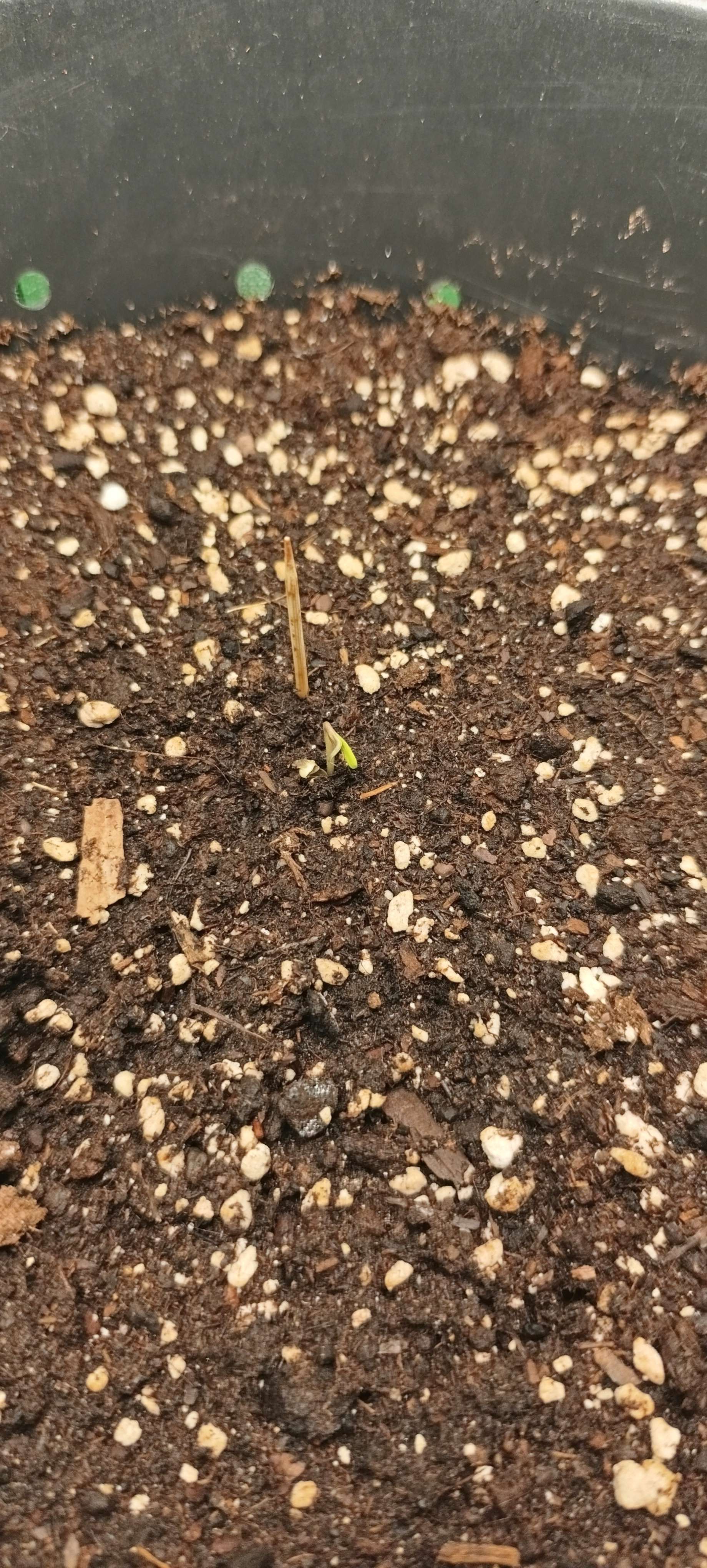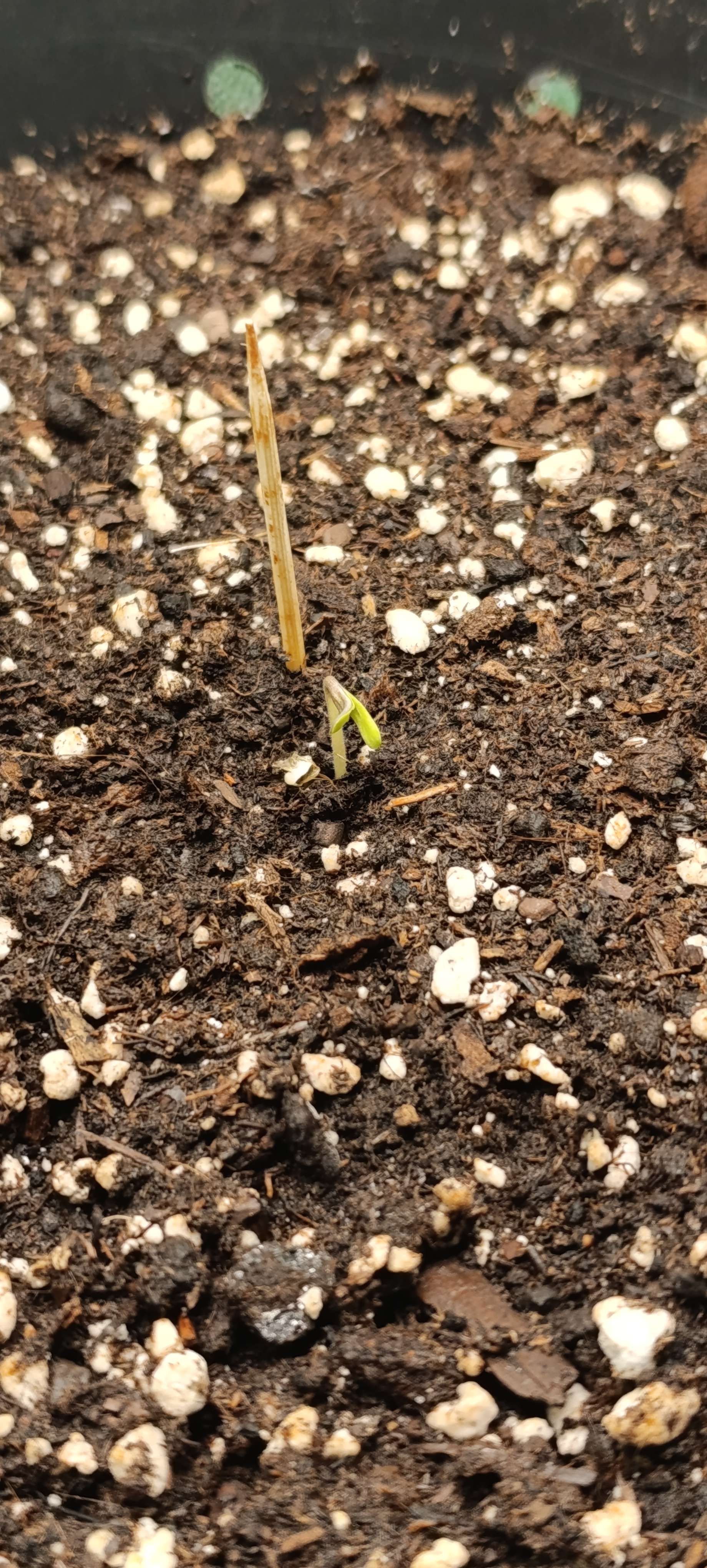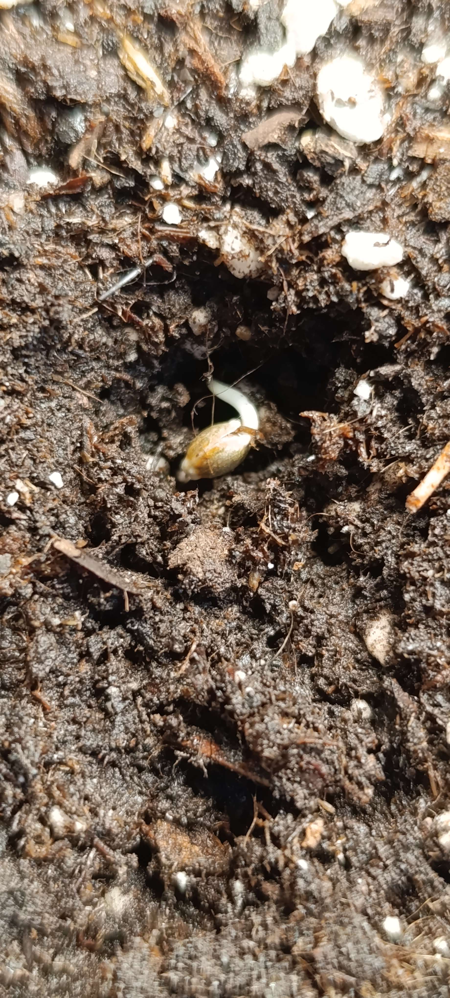 Изначально субстрата насыпаем на 8-10 см ниже края ведра. Проливаем до дренажа. После прорастания семечки (стараемся сделать утром), сажаем слегка присыпав землёй ≈ 1 см. Ставим сразу 18/6. Ждём, как правило, через сутки видим росток. Ещё через сутки росток вытягивается см на 5-7 и в это время подсыпаем влажной земли. Ждём. День на пятый росток вытягивается ещё см на 7 и на этом рост стебля до семядолей встаёт. На этом этапе подсыпаем земли до конечного уровня, получается ещё 2-4 см.