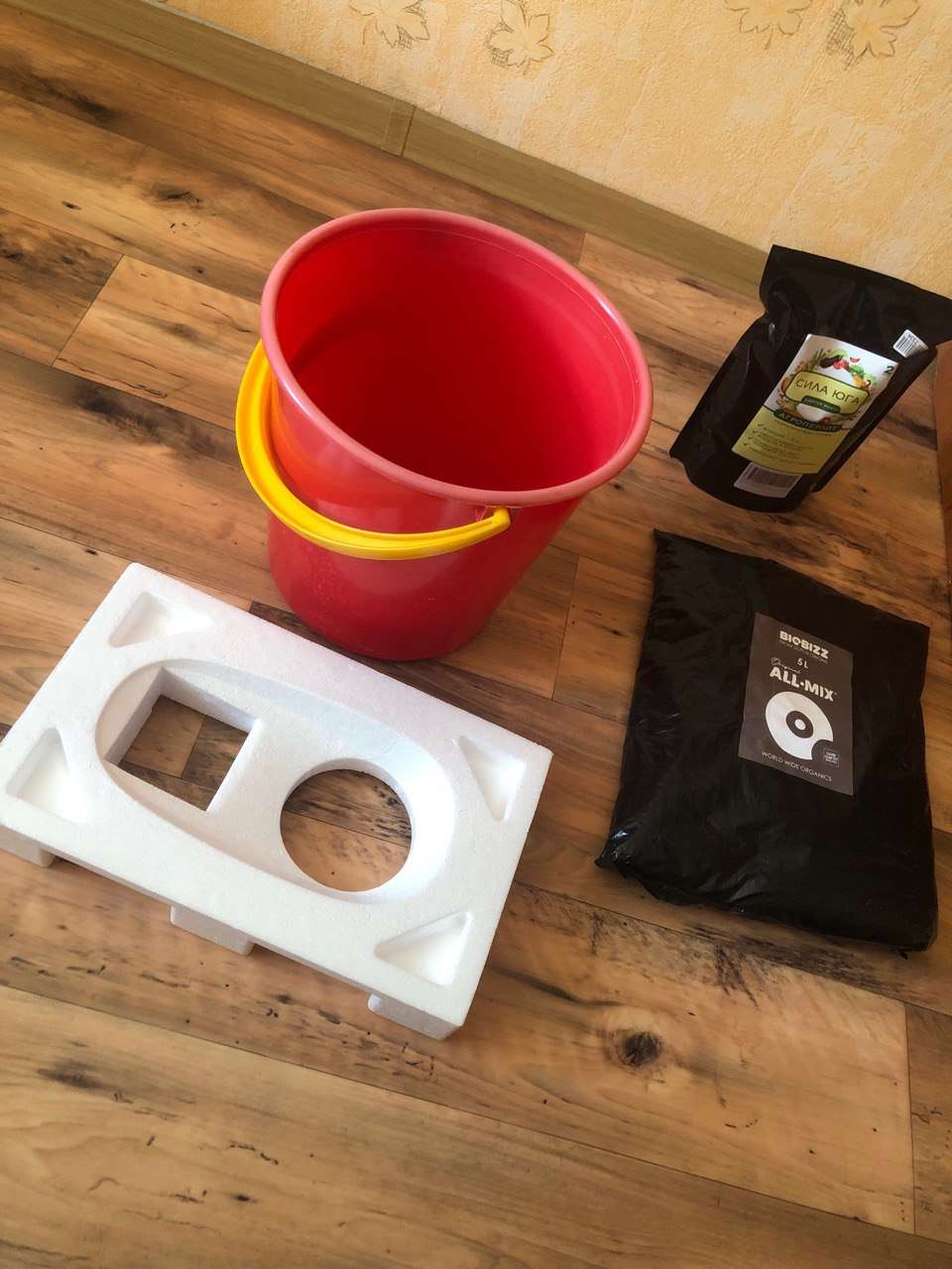 Для этого были приготовлены кусочки пенопласта, аккуратно нарезанные мной и уложенные на дно горшка - для дренажа. За ними последовал замес из почвосмеси Allmix BioBizz (5л) и перлита "Сила юга" (1л), без какого-либо уплотнения. Почва совершенно немного полита, торжественно сделана лунка в пол-фаланги указательного пальца, в нее не менее торжественно была погружена семечка, прикопана и убрана в бокс, на новое и постоянное место жительства. В добрый путь, так сказать.