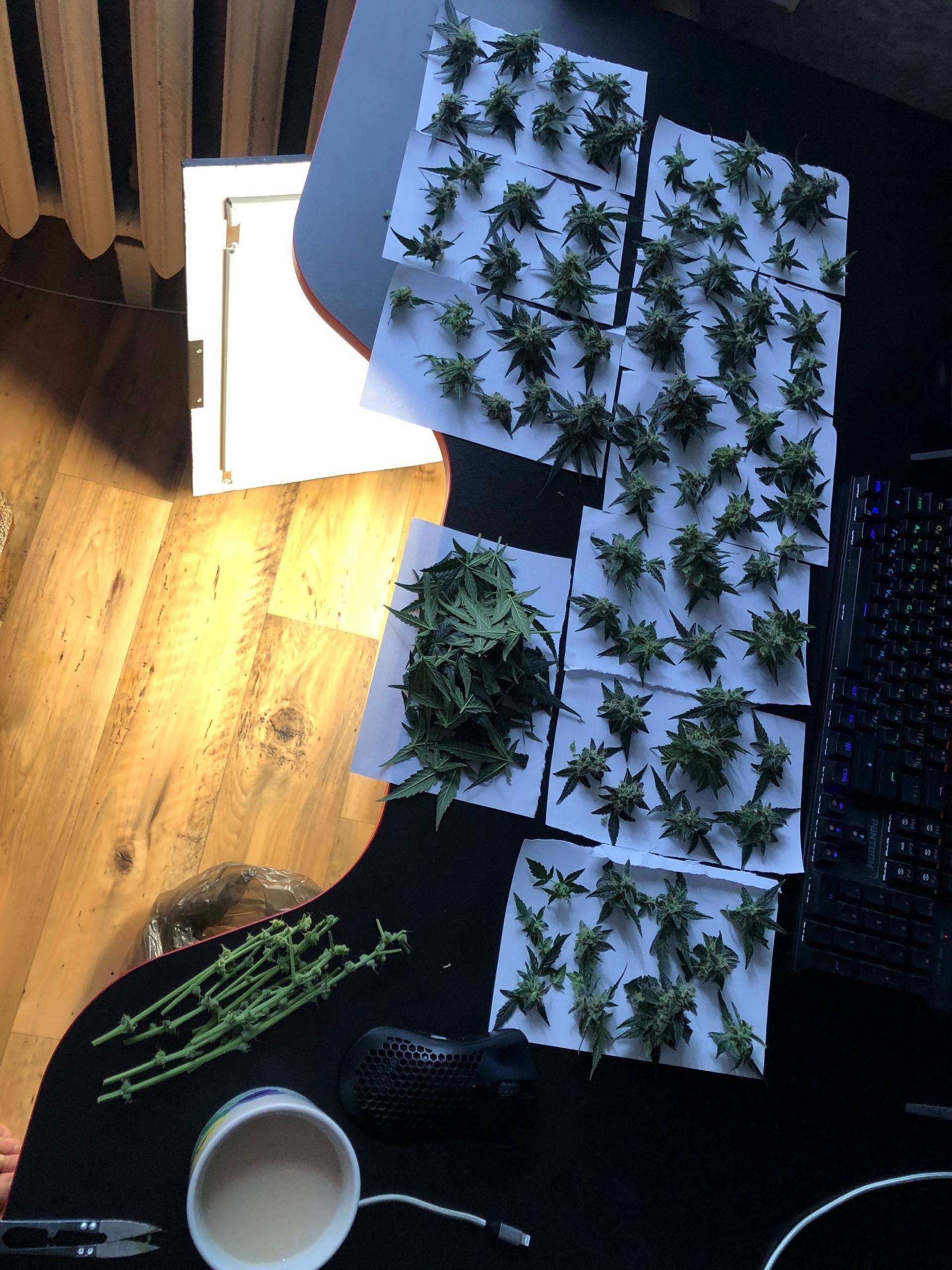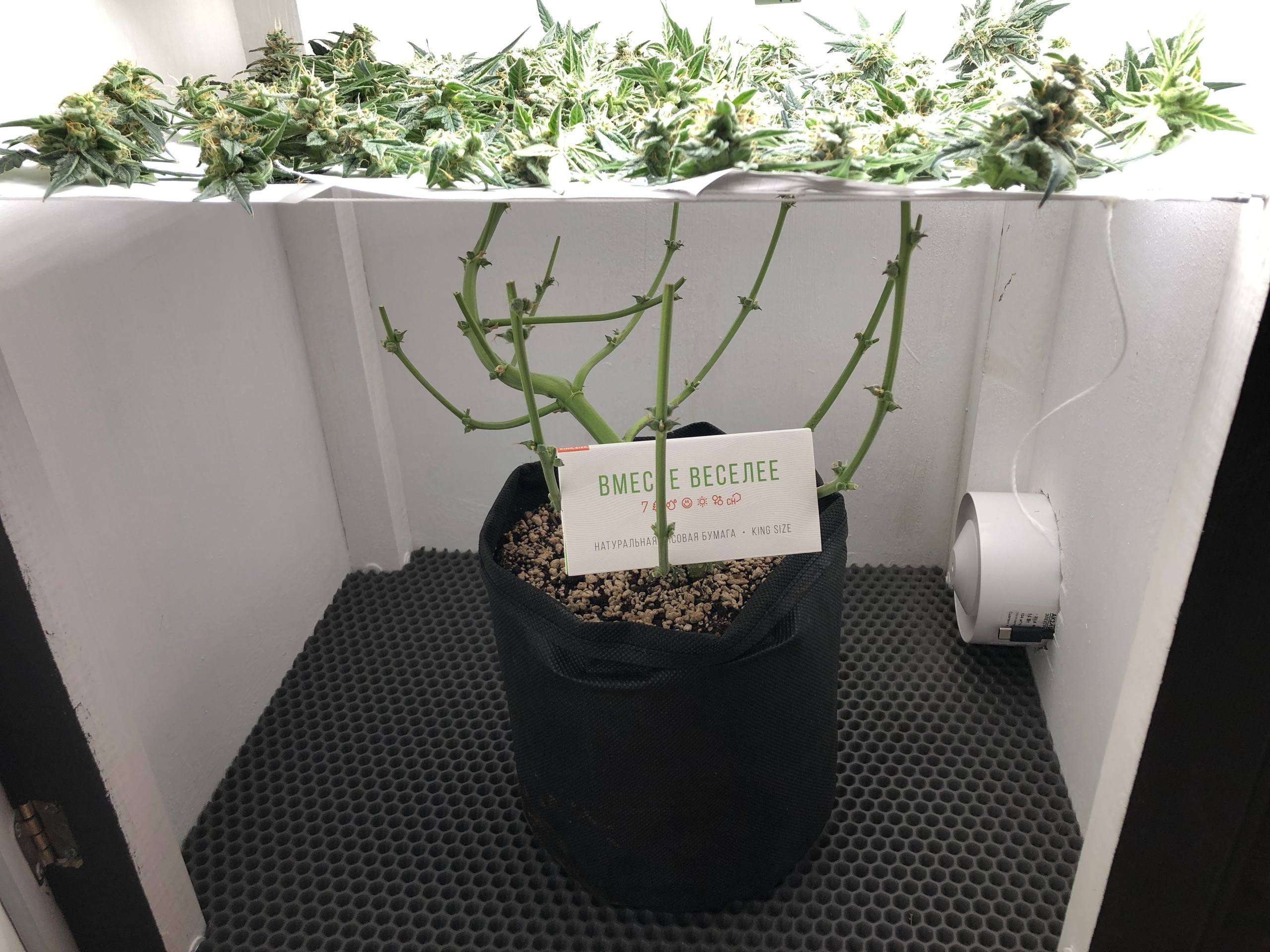 Четко в крайний день харвеста по паспорту - я снял урожай. За два дня до этого момента - только вода (хотя нечего было вымывать из растения, соли отсутствовали), двое суток темноты и в бой. Запаха сильного, активного, я вообще до самых последних дней не замечал, плюс угольный хорошо делал свою работу. Растения были срезаны, порублены до состояния шишек, отправлены на сушку в бокс на бумажных листьях. Спустя два дня - проведен трим с почти сухих, вяленых шишек, и успешно скурен) Остальное отправилось в банку с бугельным замком лечиться и храниться)