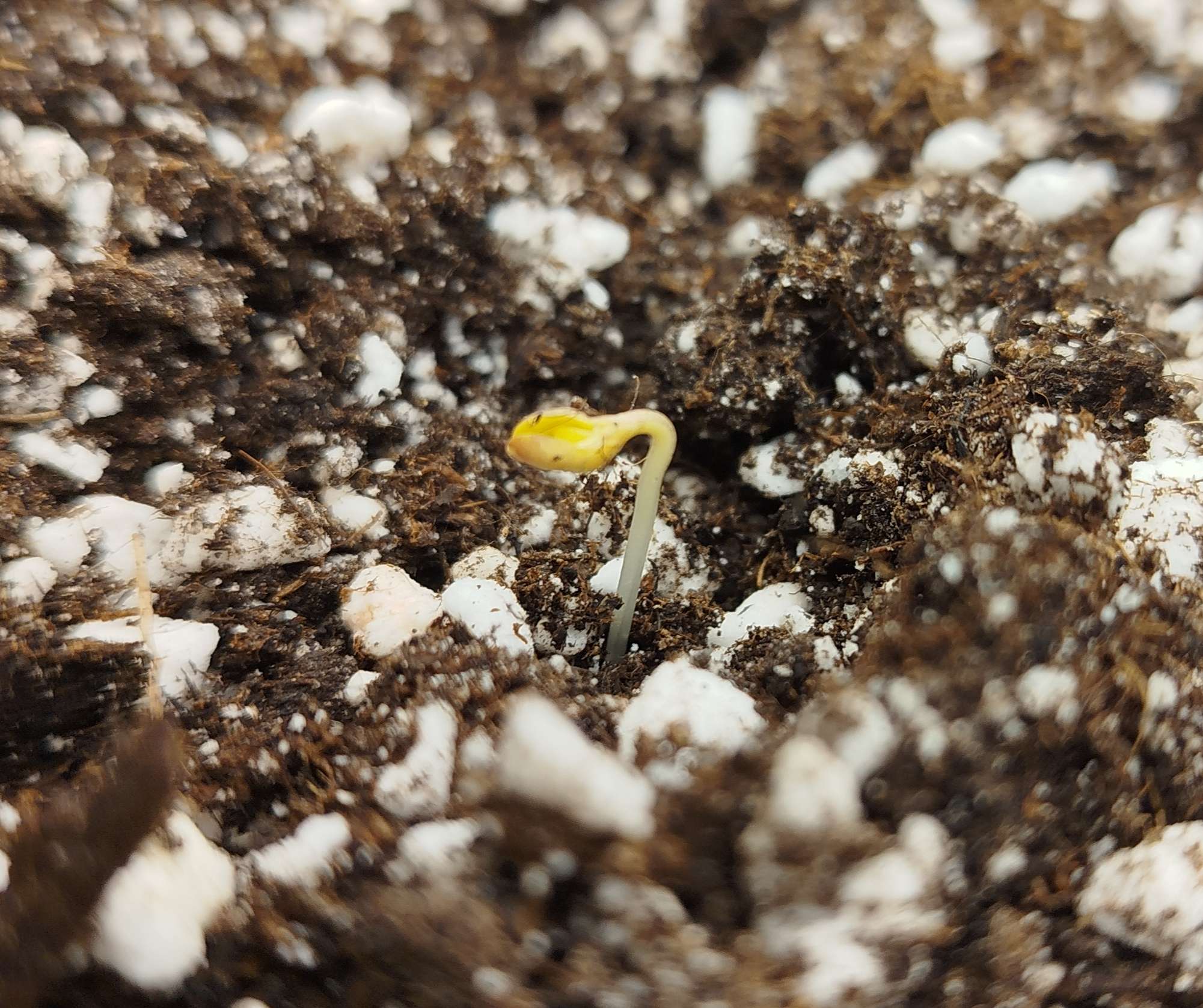 Через два дня появился жёлтый росток уже без каски, пожил пару дней под стаканчиком, но потом я заметил что первые листья начали вверх тянуться сильно и решил стаканчик убрать.