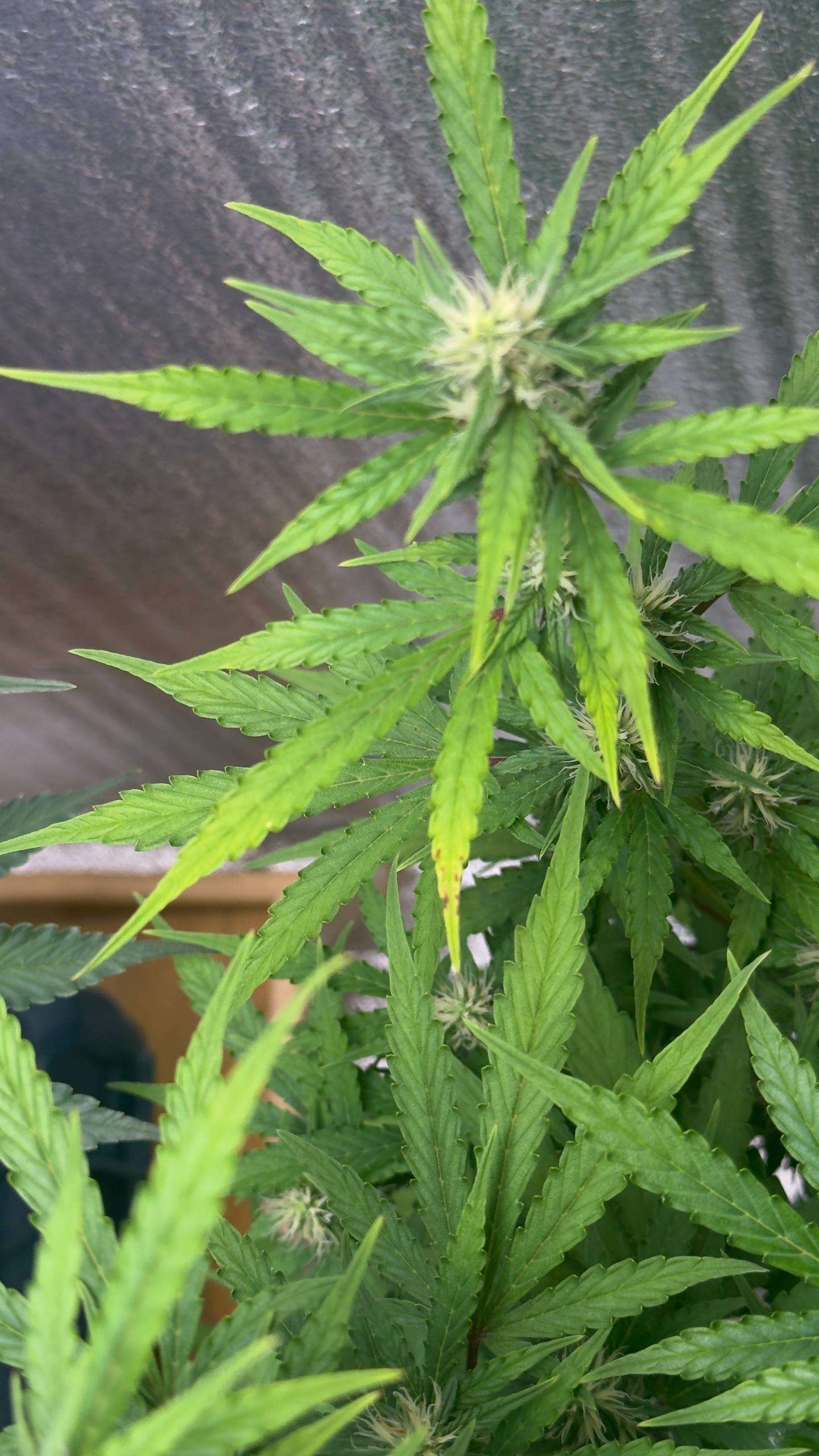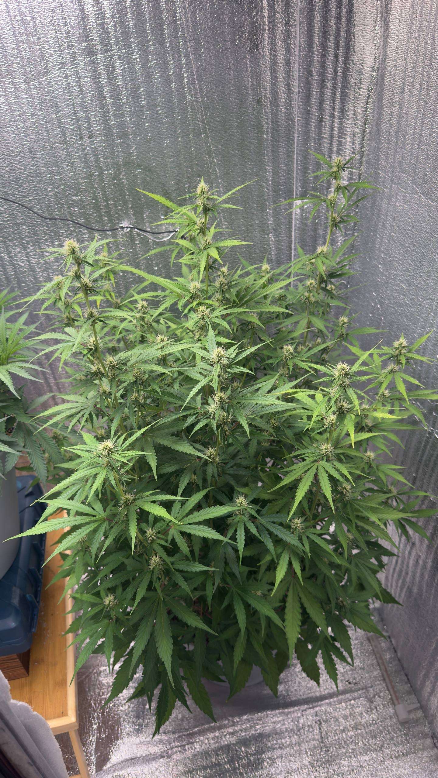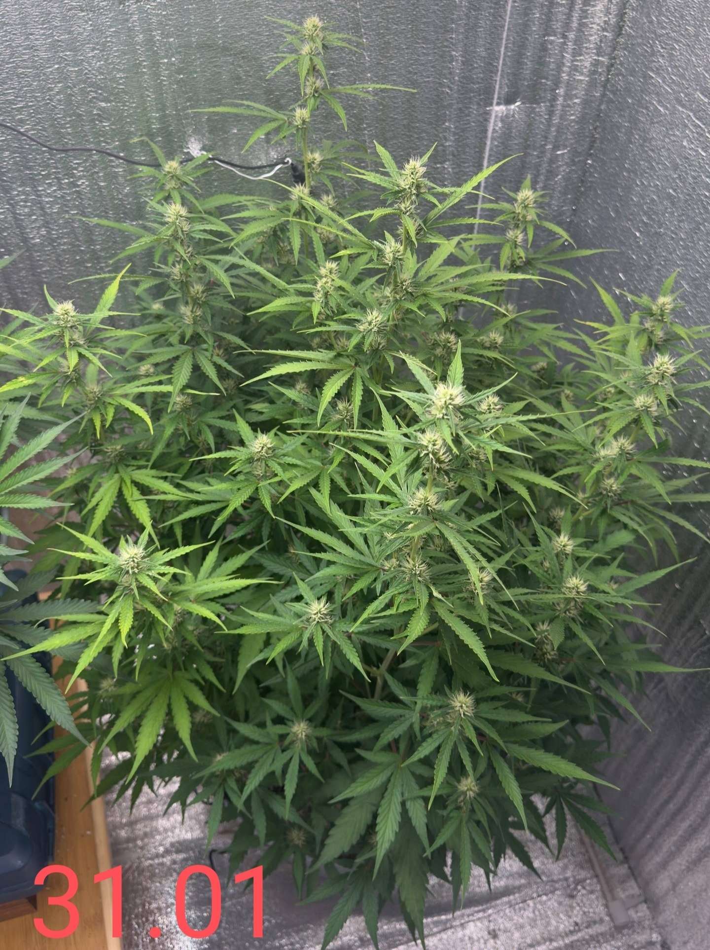 01.02 начал обрастать трихомами, сейчас уже уверенно говорю, по таблице с 8 недели нужно было топмакс 4мл/л давать, сегодня ещё 3л компота дал, с дренажом ппм 200, значит точно не профицит у растихи, поэтому думаю всё же были дефы небольшие и светом давил, исправлено, наблюдаем
