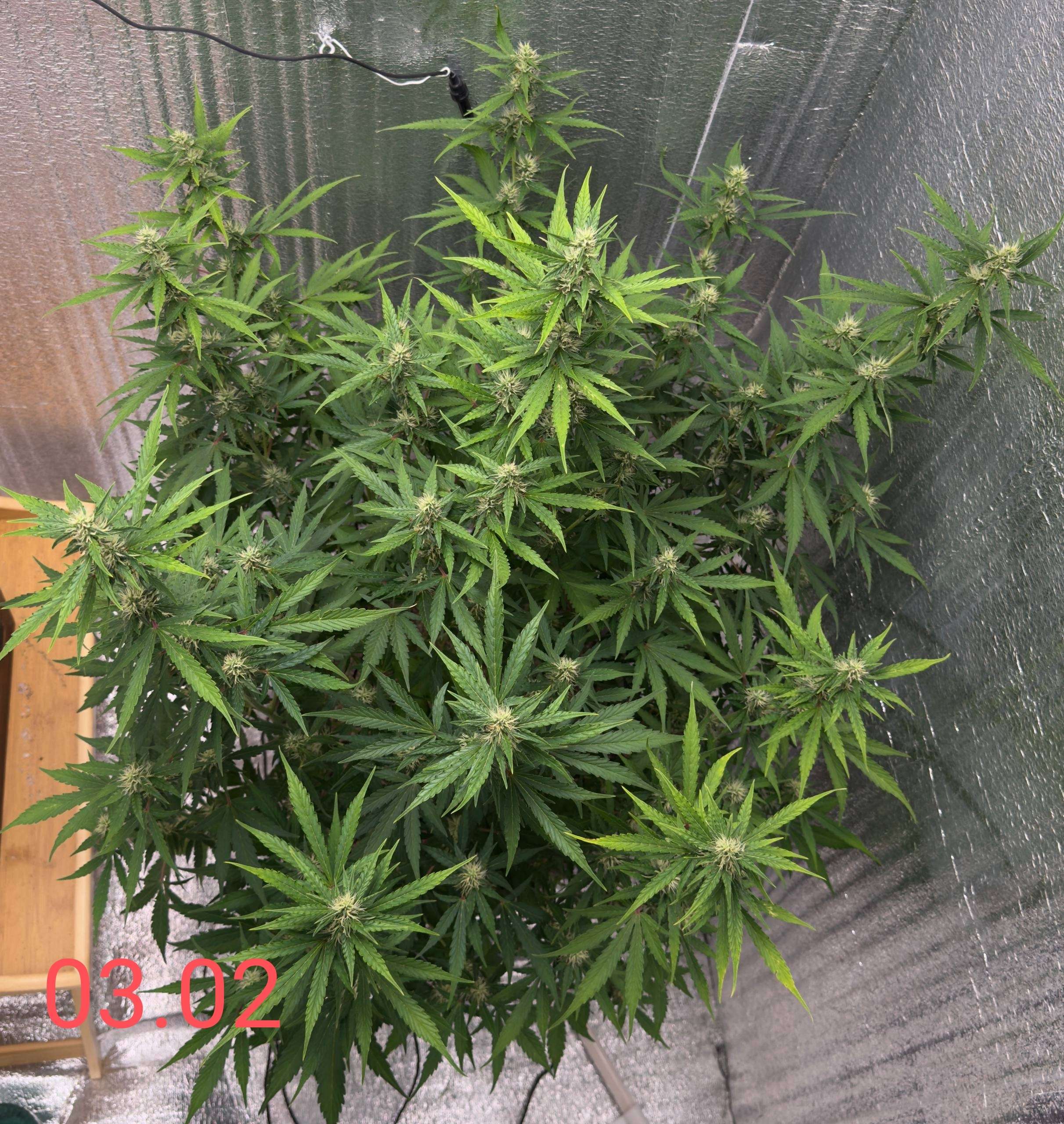 03.02 По поливам так и пьёт по 3л за 30 часов где-то, лью только компот, реагирует хорошо вроде, сегодня поубирал проволоку и окончательно растянул и подвязал колы, как раз на пол бокса кустик вышел, вертикальный рост полностью закончился, начали жиреть шишки, обрастает сахаром, в общем всё идёт хорошо, тьфу тьфу тьфу
