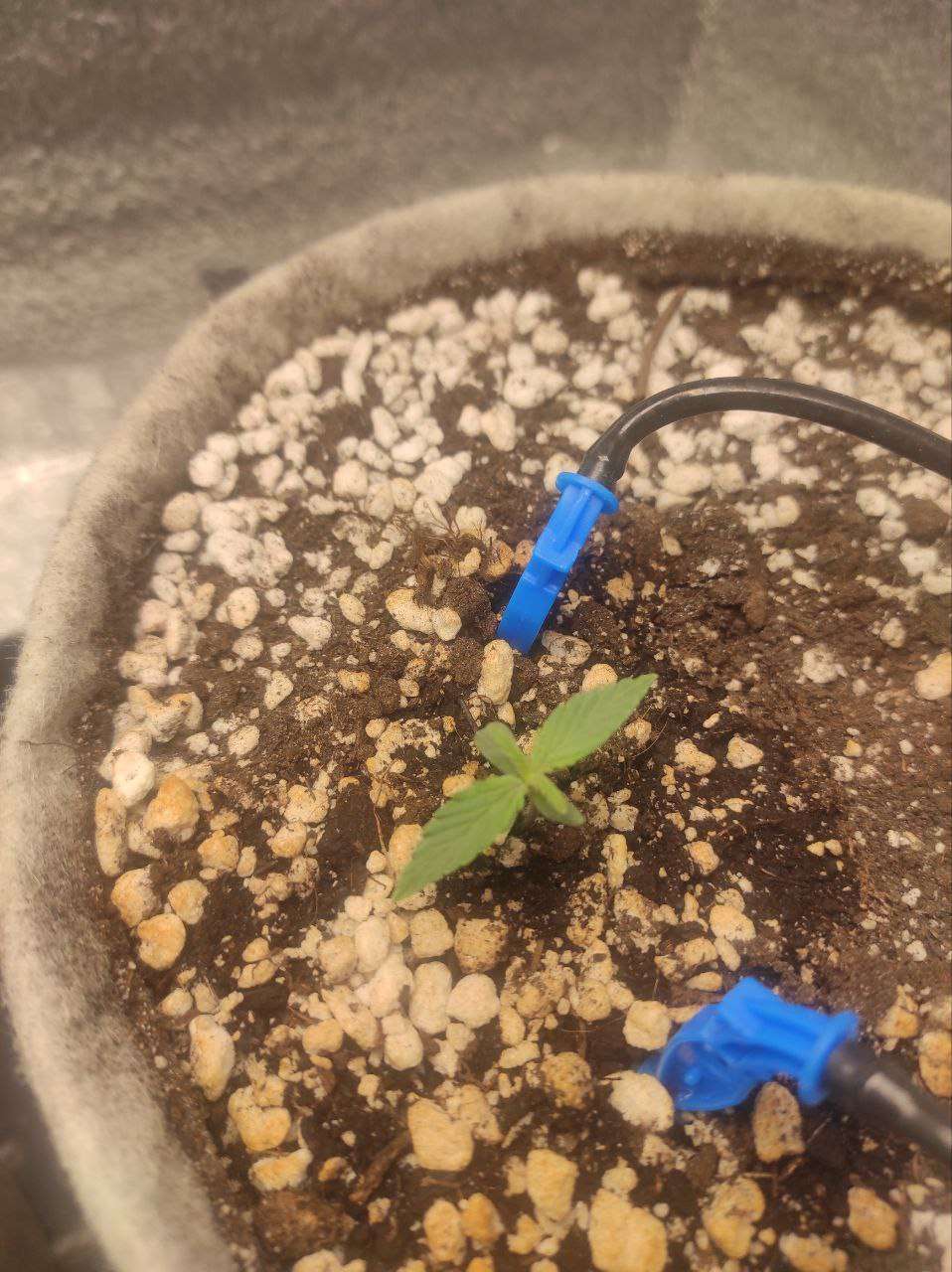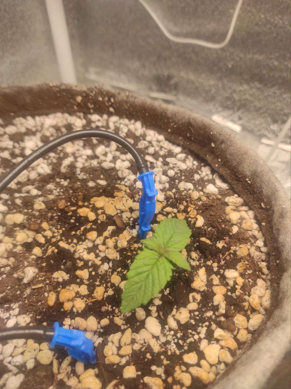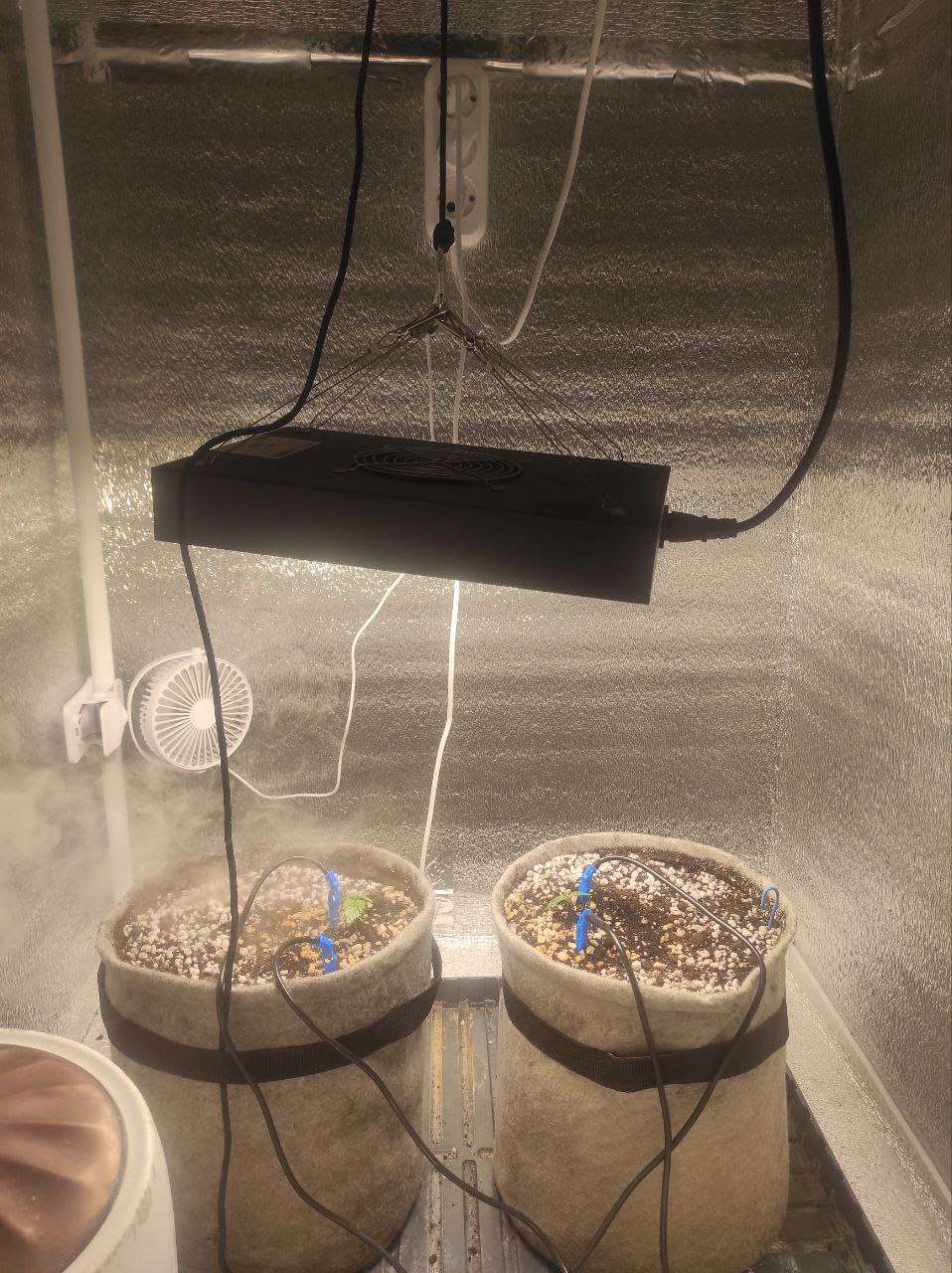 Всех приветствую! Сегодня ровно неделя от каски, и пока писать особо нечего — растут наши малыши. Перешёл на полив один раз в сутки по 350 мл и подключил автополив для удобства. Увлажнитель работает на максимум круглосуточно, влажность держится в районе 70–80%. Днём температура поднимается до 30°, ночью опускается до 22°. Ждём, пока окрепнут, и тогда начнём тренировки. На фото тот, что поменьше — это медицинский сорт.