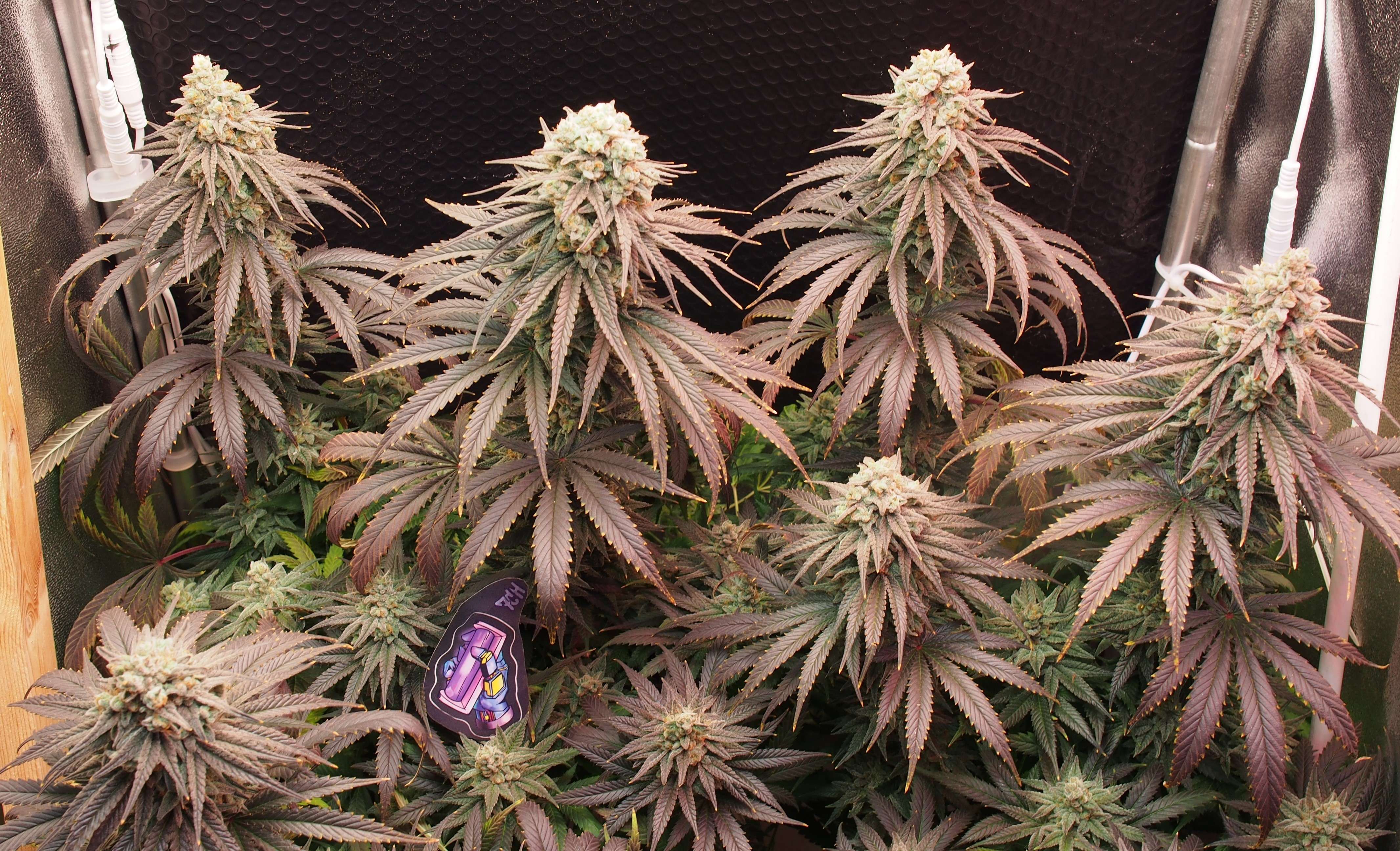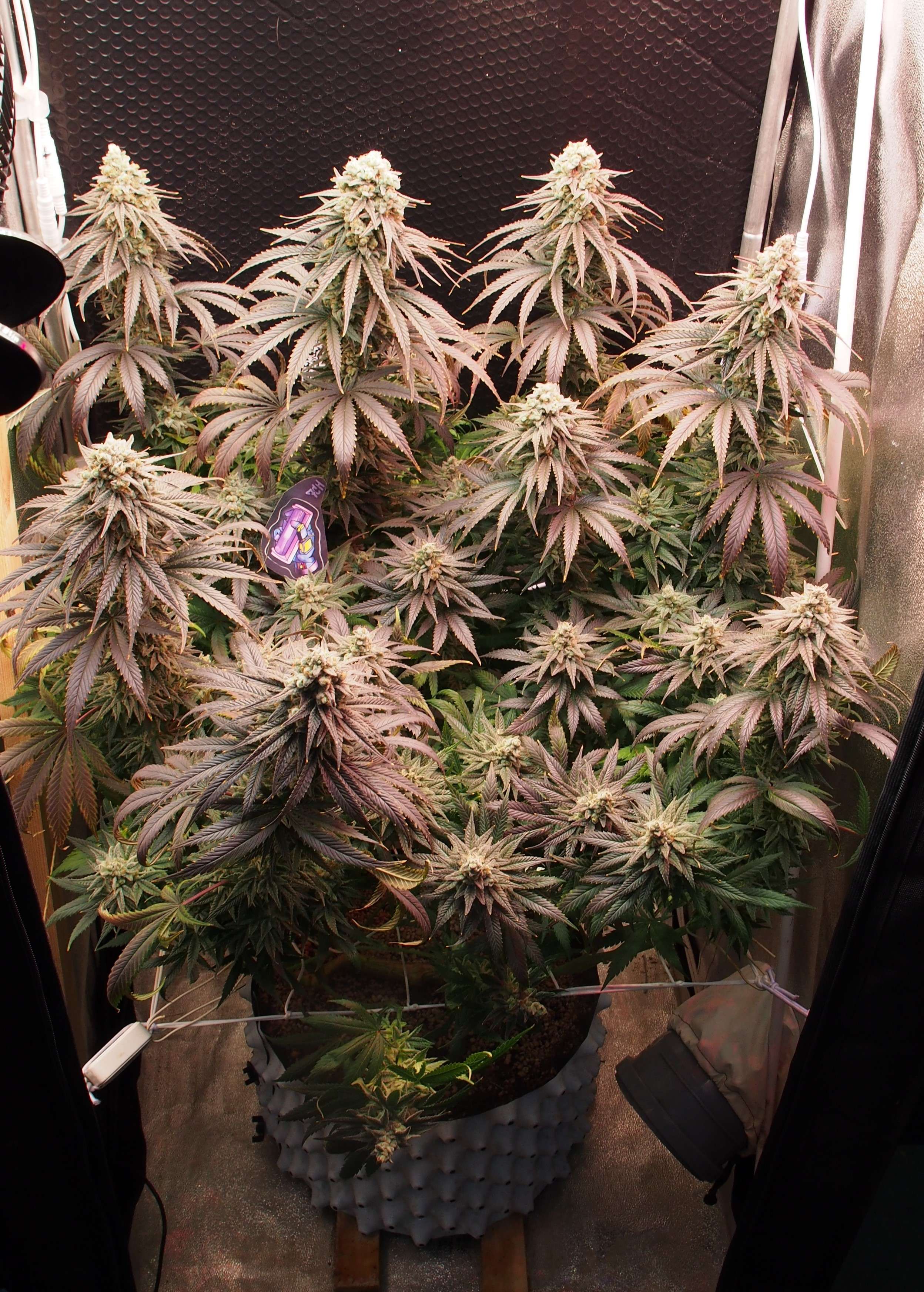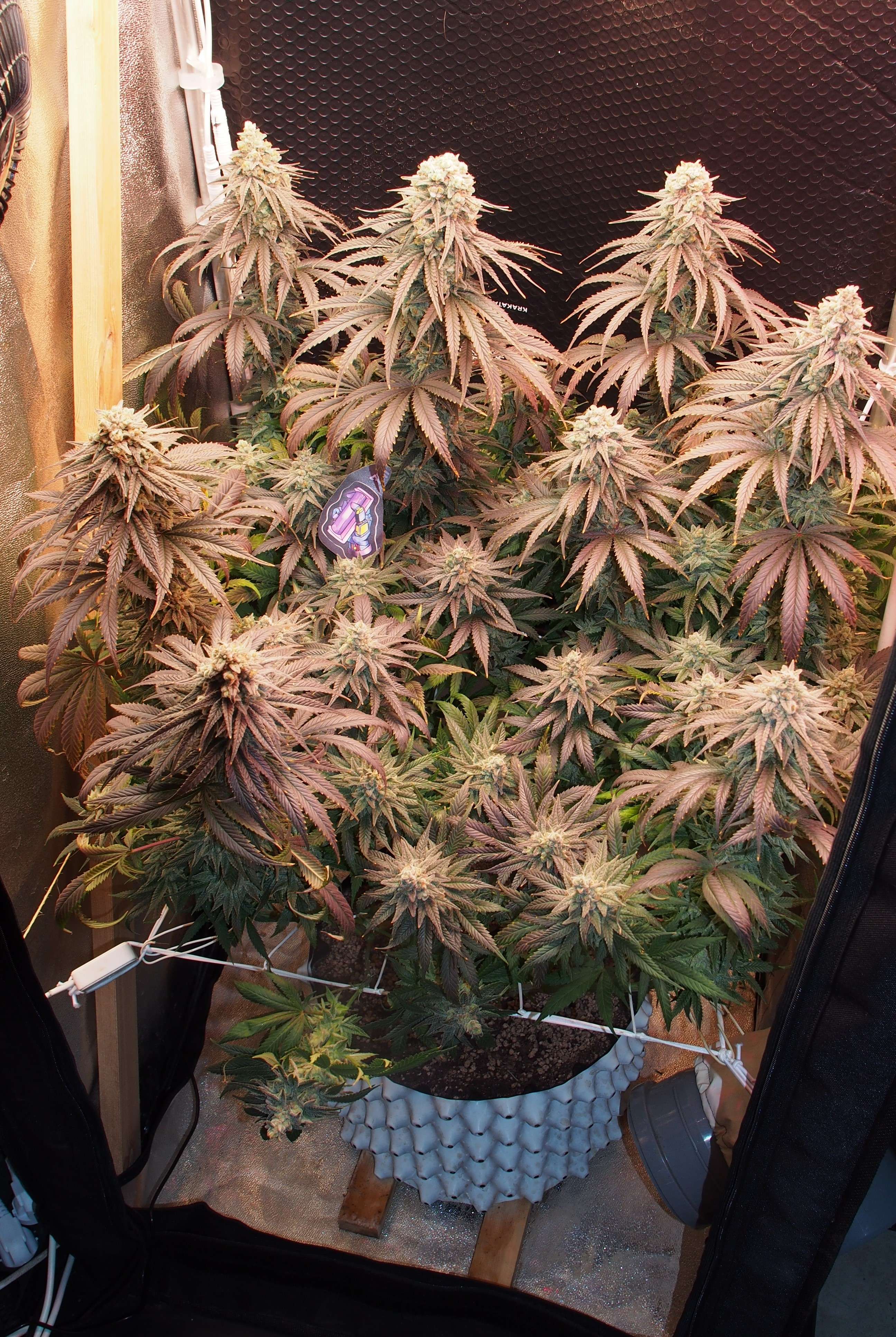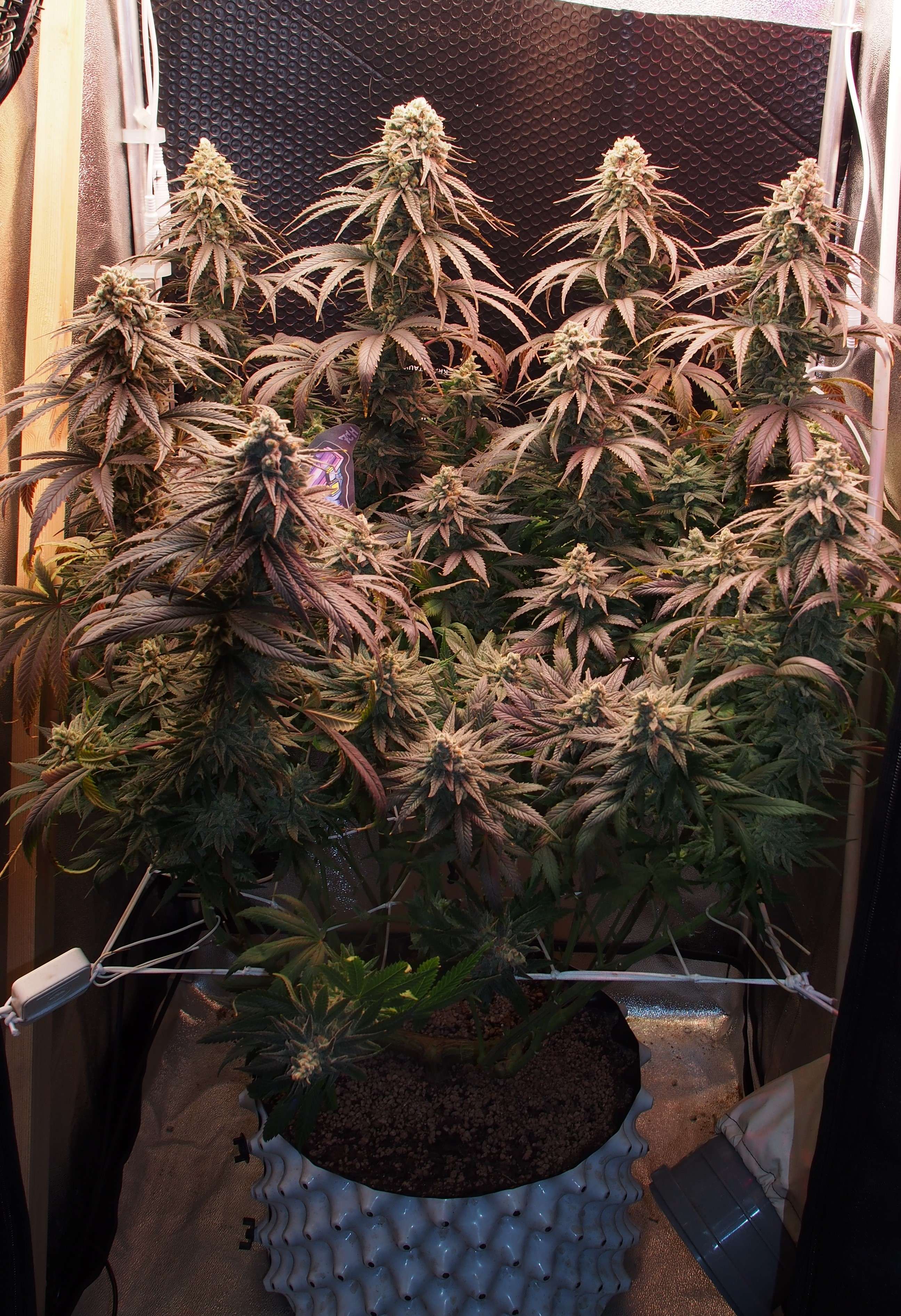 Все колы, которые не являются "центральными" - на тонких "ножках", поэтому уже не выдерживают веса соцветий и просто разваливаются и виснут не смотря на скрог-сетку. Я на прошлой неделе жаловался на маленький бокс..но, сейчас все эти вторичные колы удерживаются только благодаря тому, что опираются на стенки бокса. Пришлось бы мастерить вокруг куста типа, кольца из проволоки чтобы он окончательно не развалился.