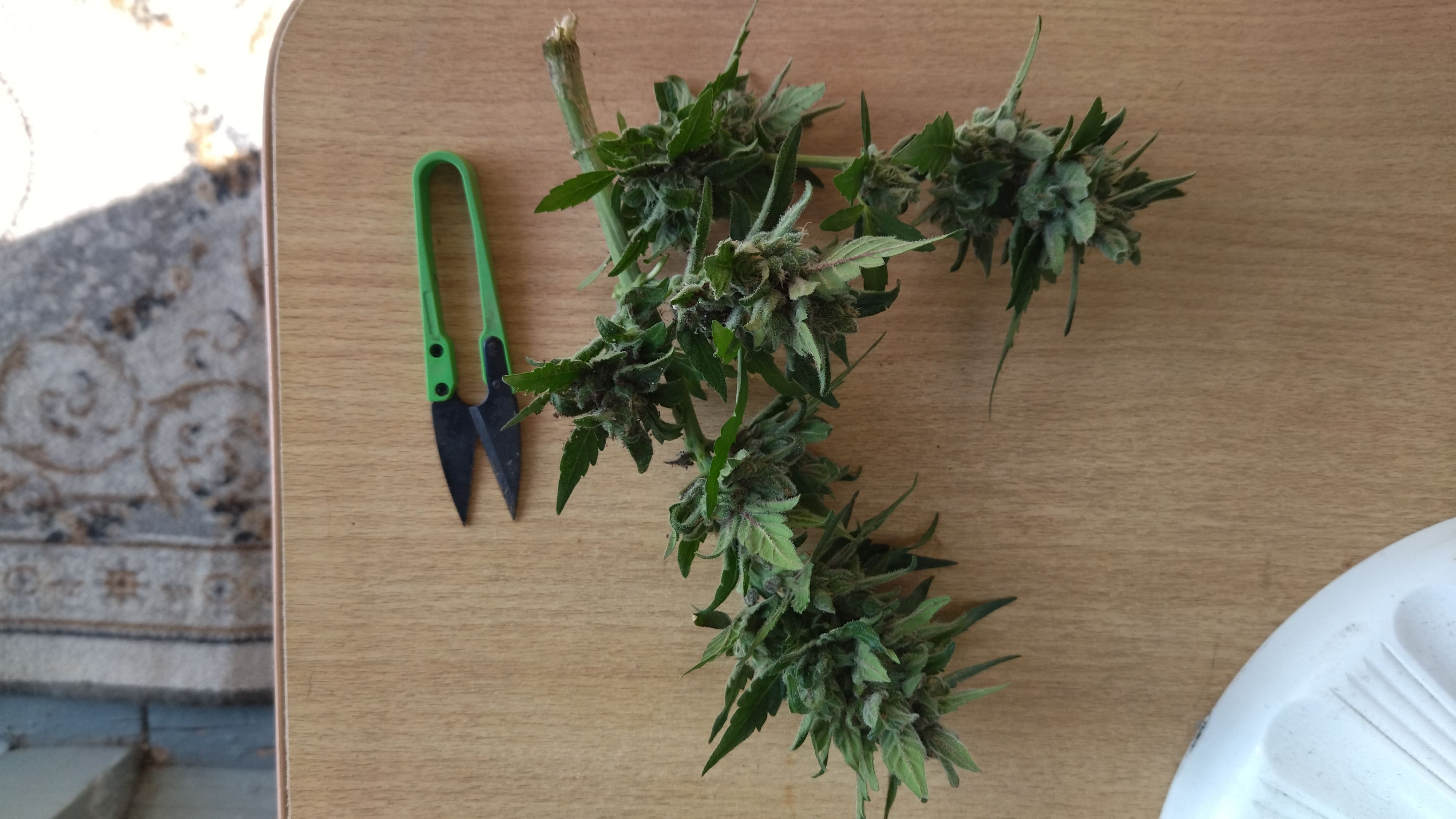 Остался один бонусный карлик. Сантиметров 35-40 максимум. Вот такой недоросль, однако трихомы красивые. Холодно уже в теплице, пора снимать