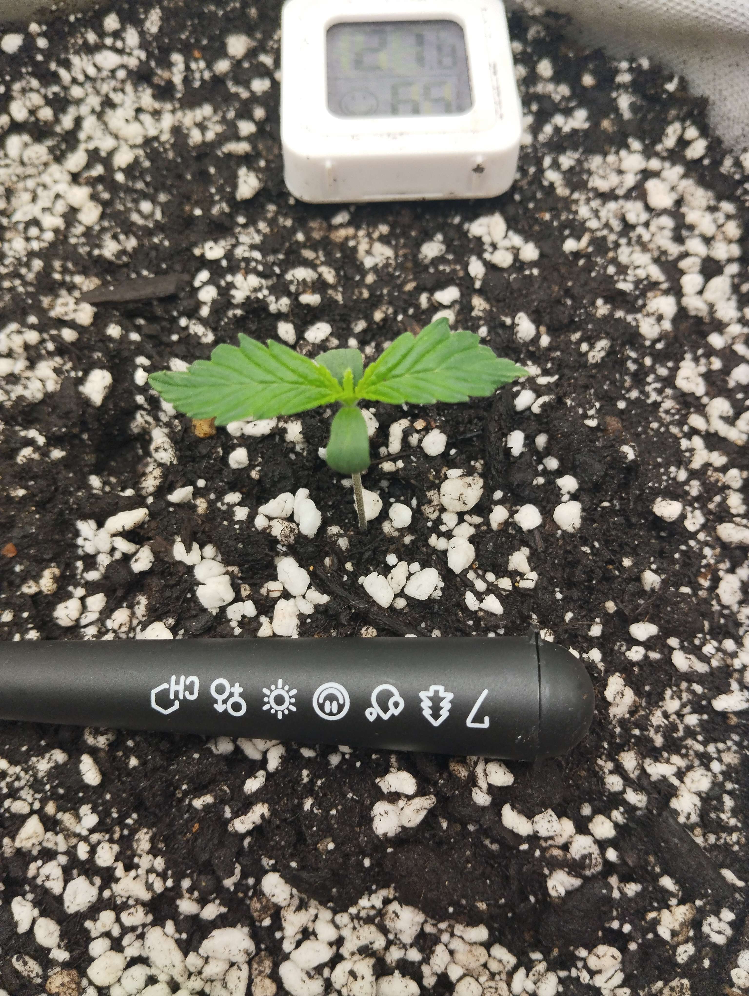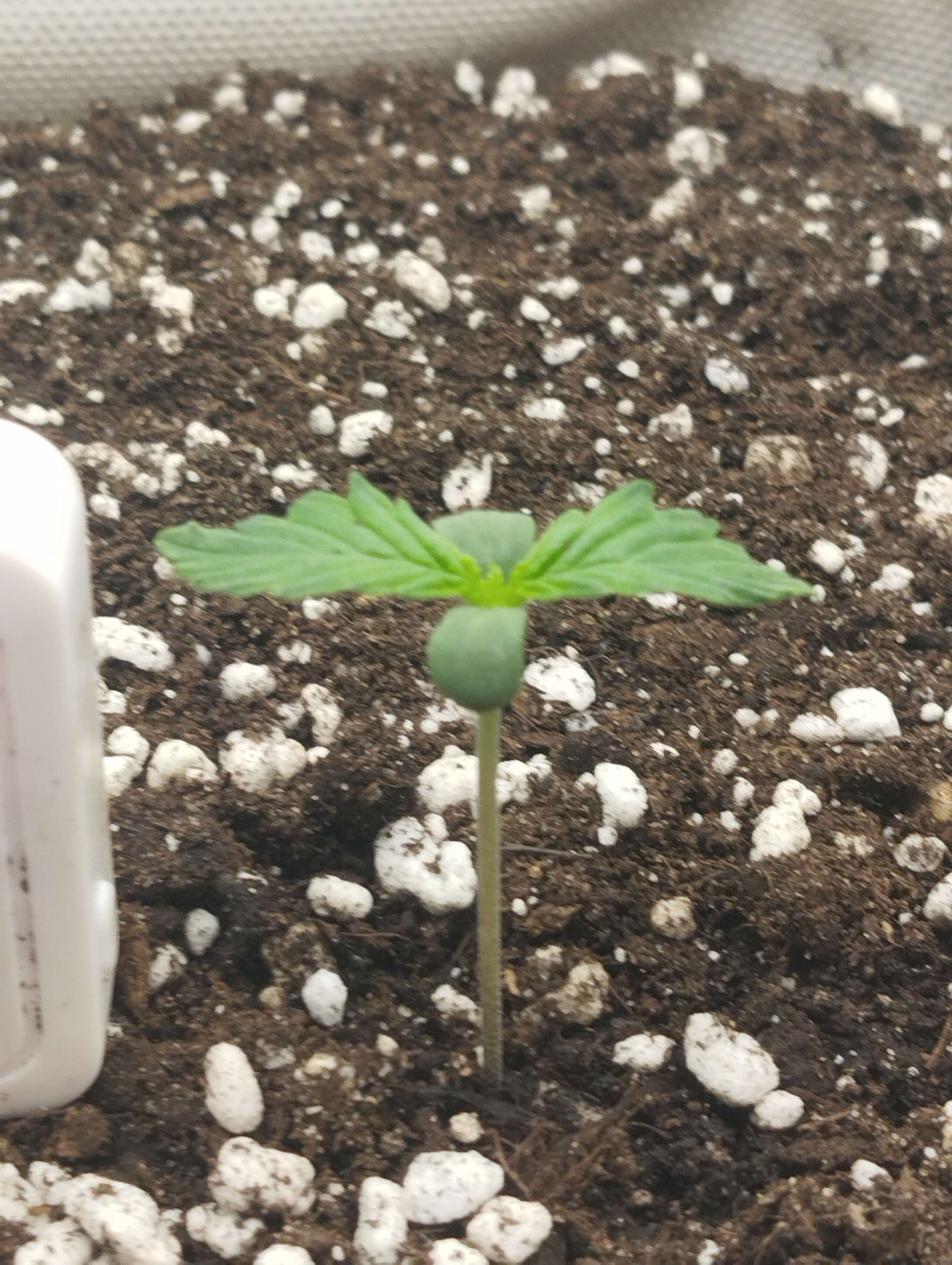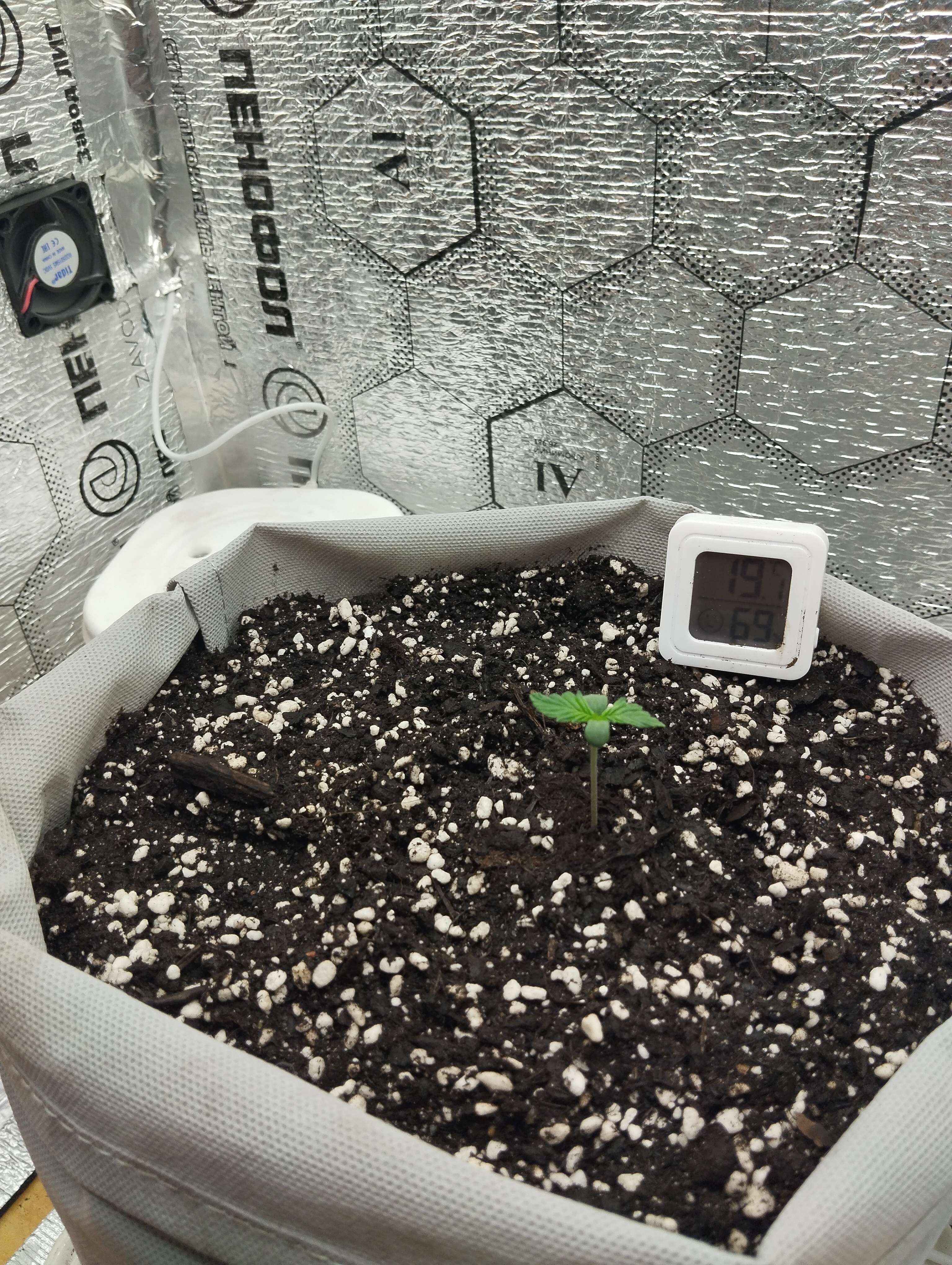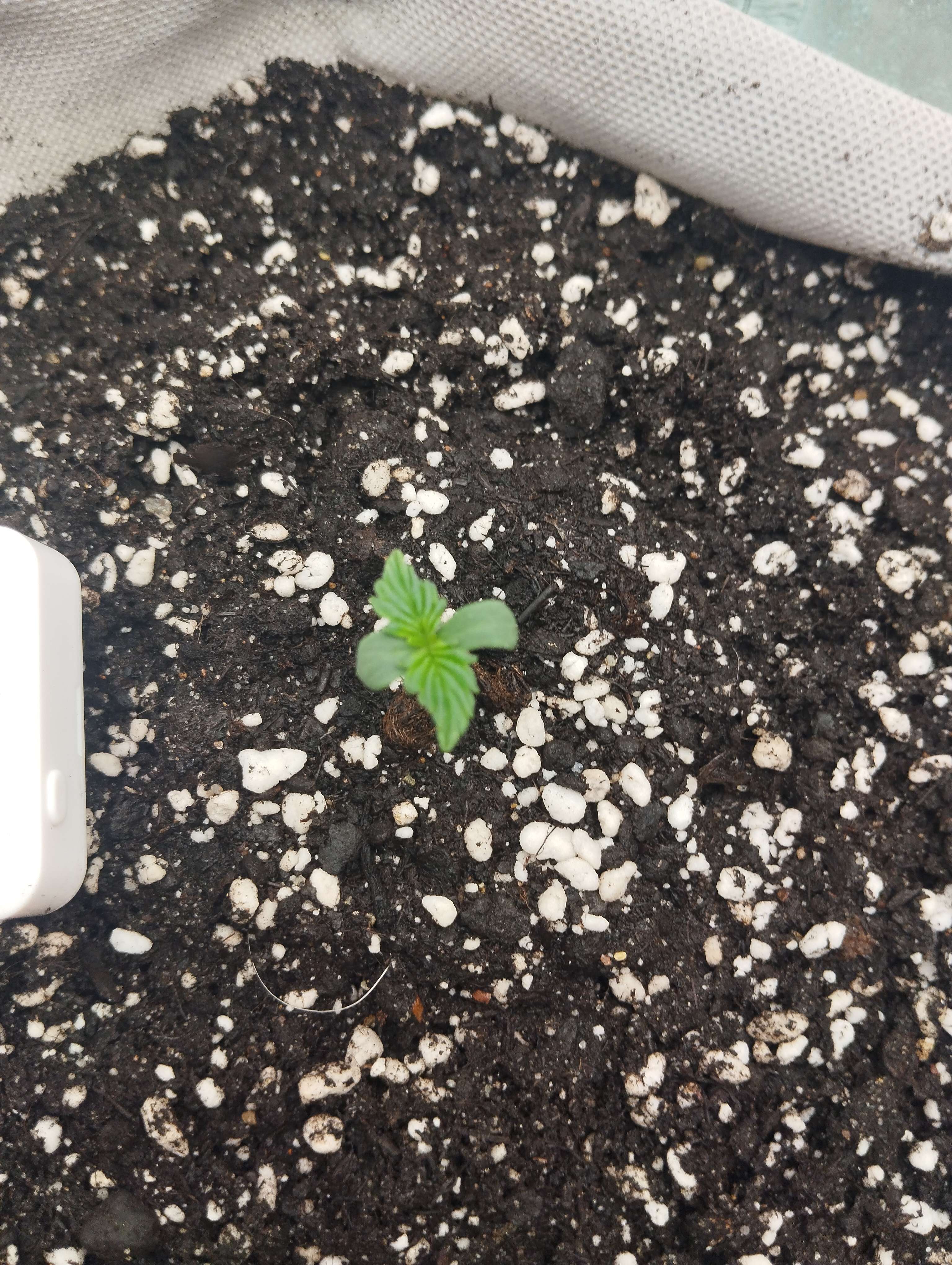 19.02 Заключительный день недели. Замешал 50℅ от дозы удобрения для корней и улучшения почвы. 50℅ аминокислоты 70 шт, 16℅ азота и ещё куча всего. Под корень как пишут лить не стал много. Со шприца 30 мг примерно и остальное по кругу с увеличением к краям . Грунт абсолютно сухой. Дренажа нет. Оно и понятно это ещё литр воды надо. Пролить как бы надо посмотреть дренаж, потому что я не знаю что там вообще, горшок не проливал, а только брызгал слоями, когда насыпал. Сейчас наверное уже нет смысла проливать. На новой неделе это сделаю всё равно. Горшок взвесил для себя после полива, чтобы не ломать голову просох грунт или нет. Сделаю дренаж и решу уже насчёт компота что и как, посоветуюсь конечно. Температура 24,5 , влажность 55-60. Свет 12000 люкс, PPDF 250.Расстояние до макушки 36см, но это наверное ни о чем не говорит у всех разные лампы. Пока всё жду замечаний, если есть. Первый гров должен быть насыщенный, иначе не научишься ничему. Прибавил ещё свет до 13000к lx. Только начали появляться ещё пара листьев. Не знаю даже, но мне кажется она тянется. Листья от ствола 30 градусов. Размер 5 на 5см, но с посыпкой. Не нашёл репорт с этим сортом. Думаю отстаёт по развитию с этим дрочиловом по климату. Подсохнет буду давать еду 50℅.