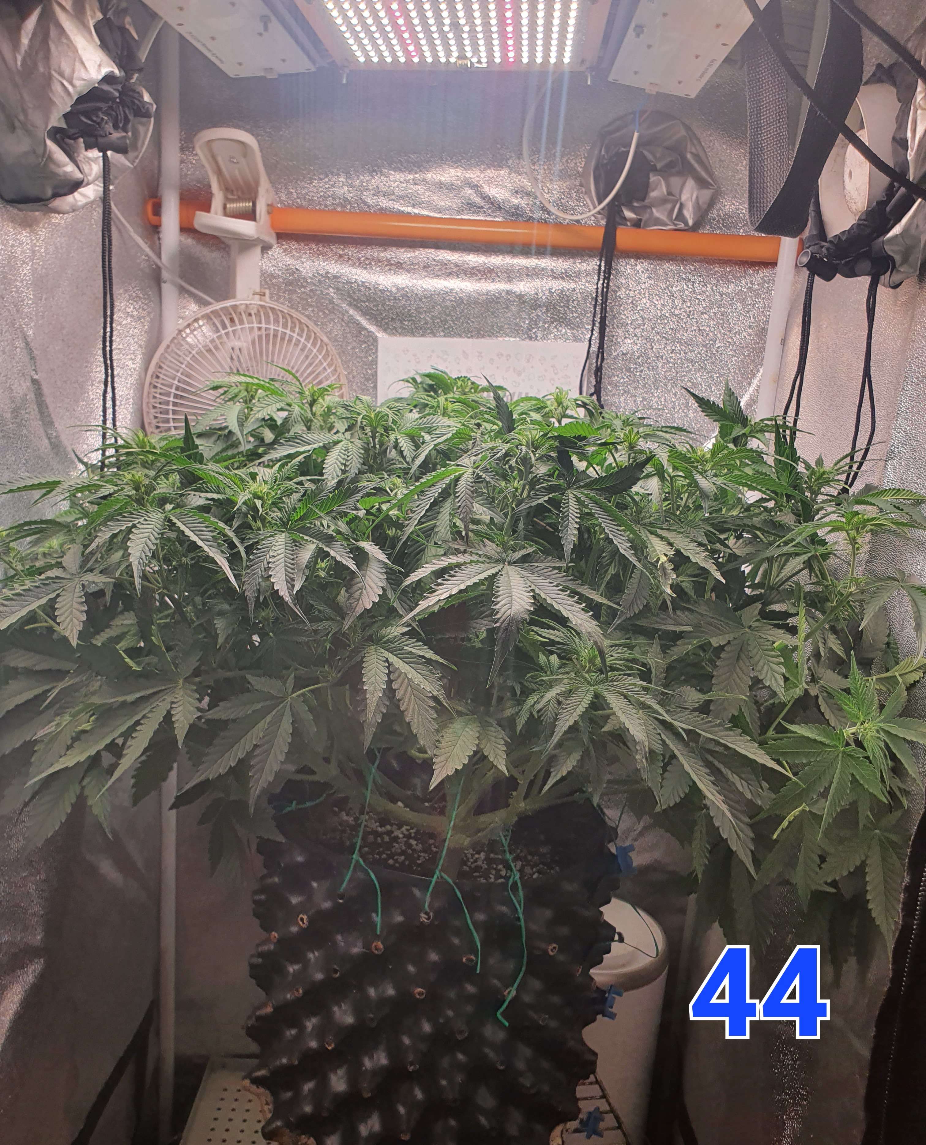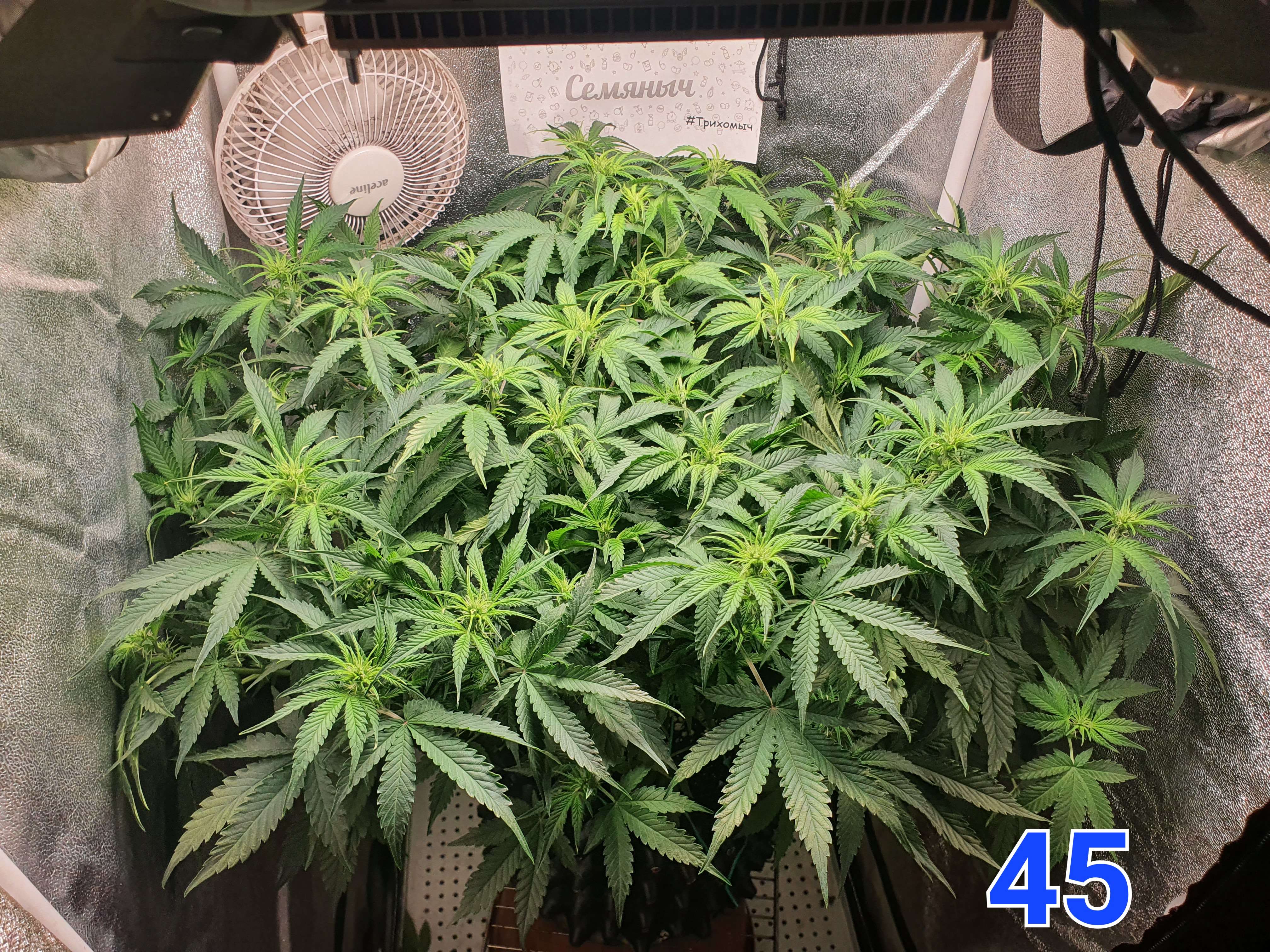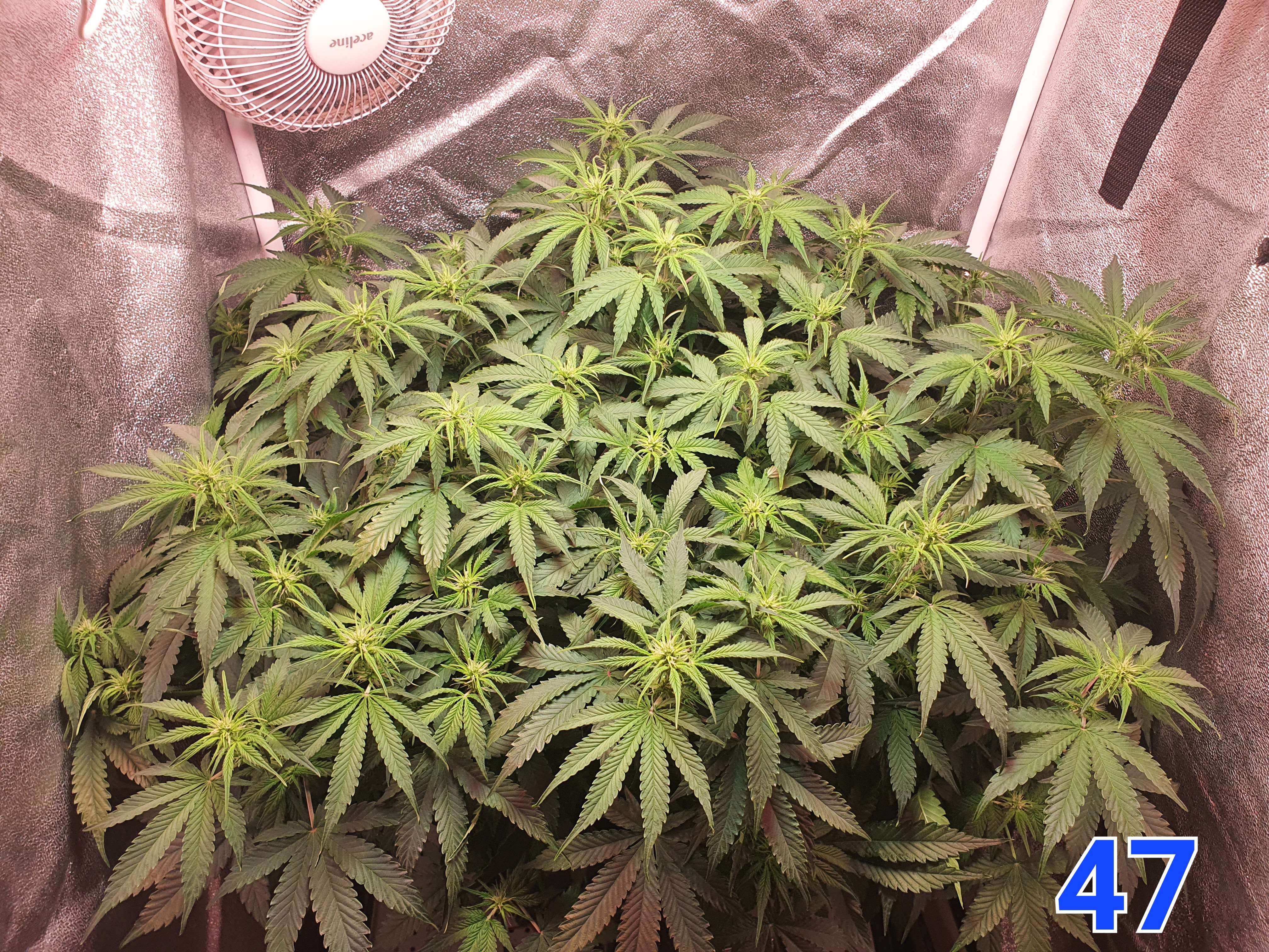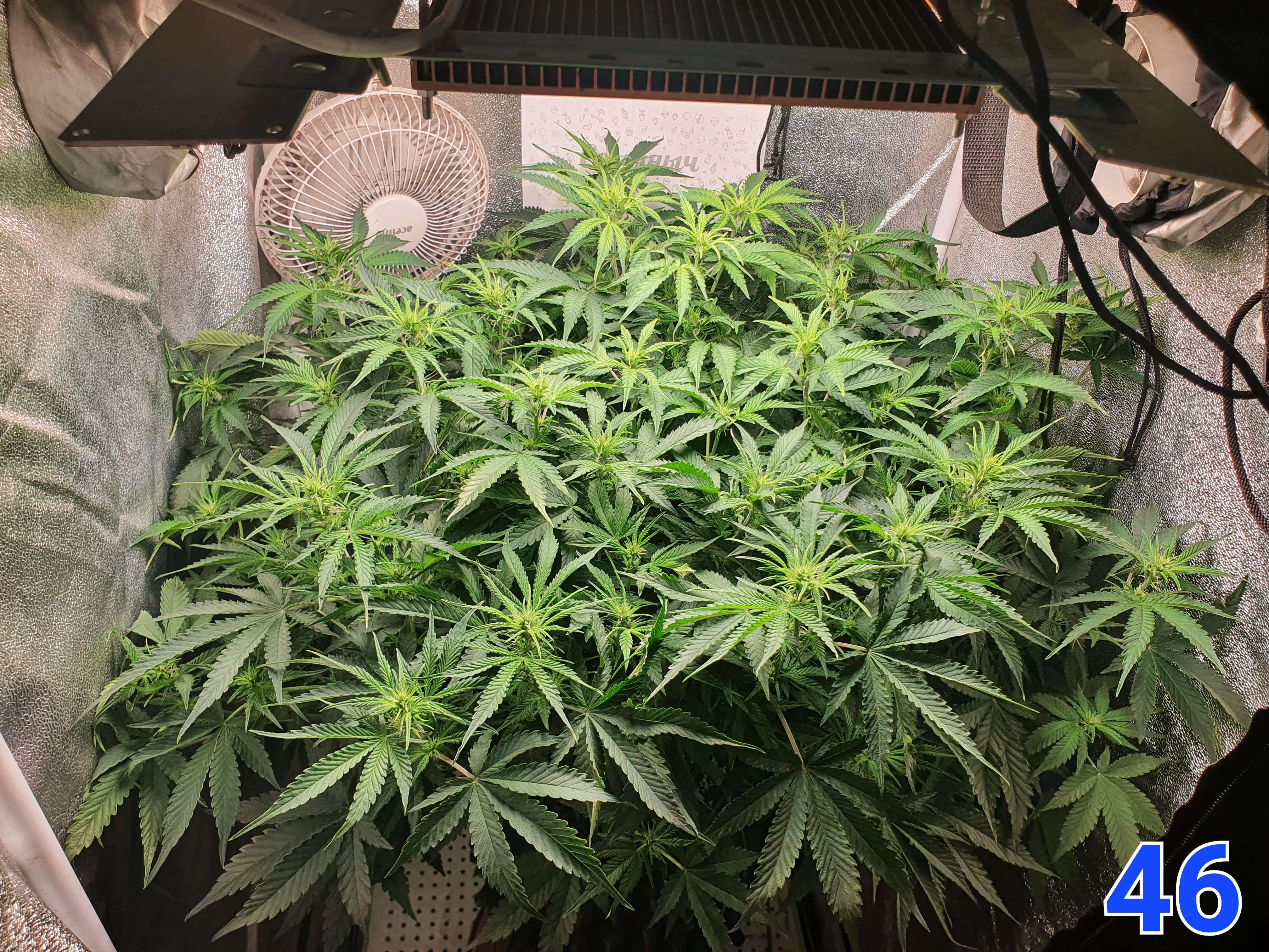 На 47й день увеличил расстояние между растишкой и лампой и добавили бустеров 660nm, а так же подключил угольный фильтр. В боксе 31 градус, жарковато, растишке не очень комфортно в таких условиях. Может чутка вентиляцию модернизировать нужно будет, но нужно смотреть. В компот добавил Simplex VitaS на пробу, надеюсь куст положительно отреагирует т.к. раньше не пробовал этот стимулятор.