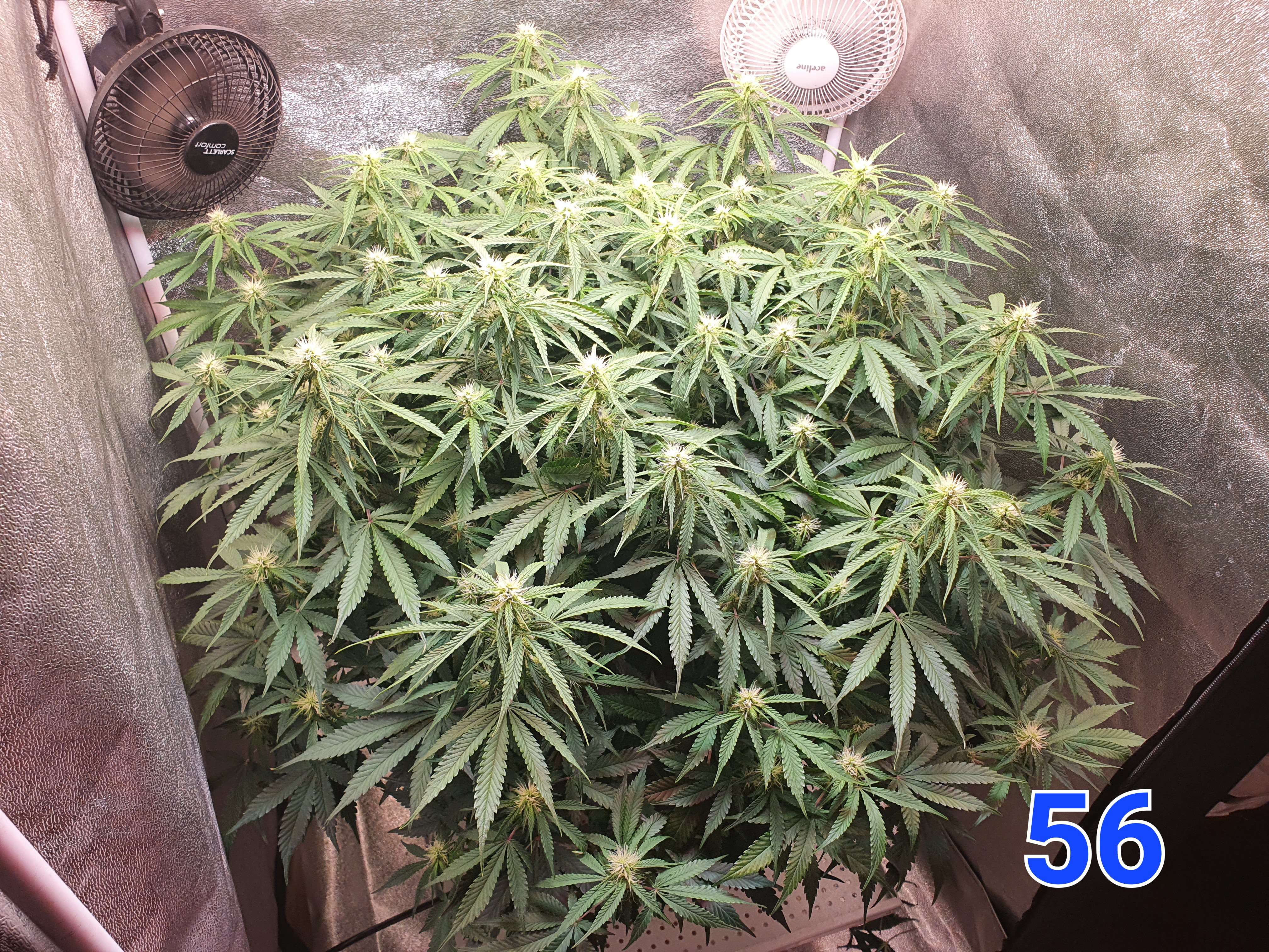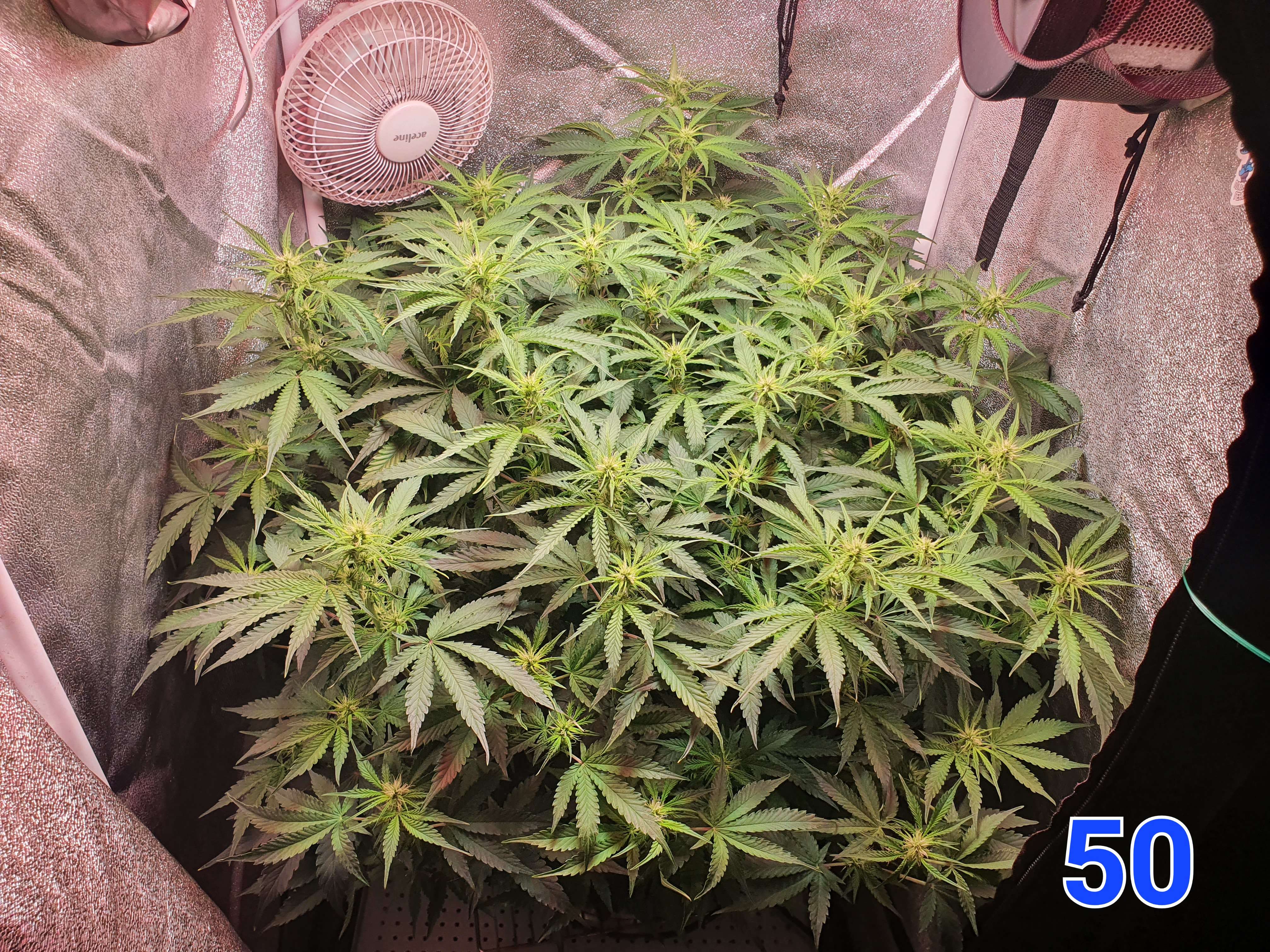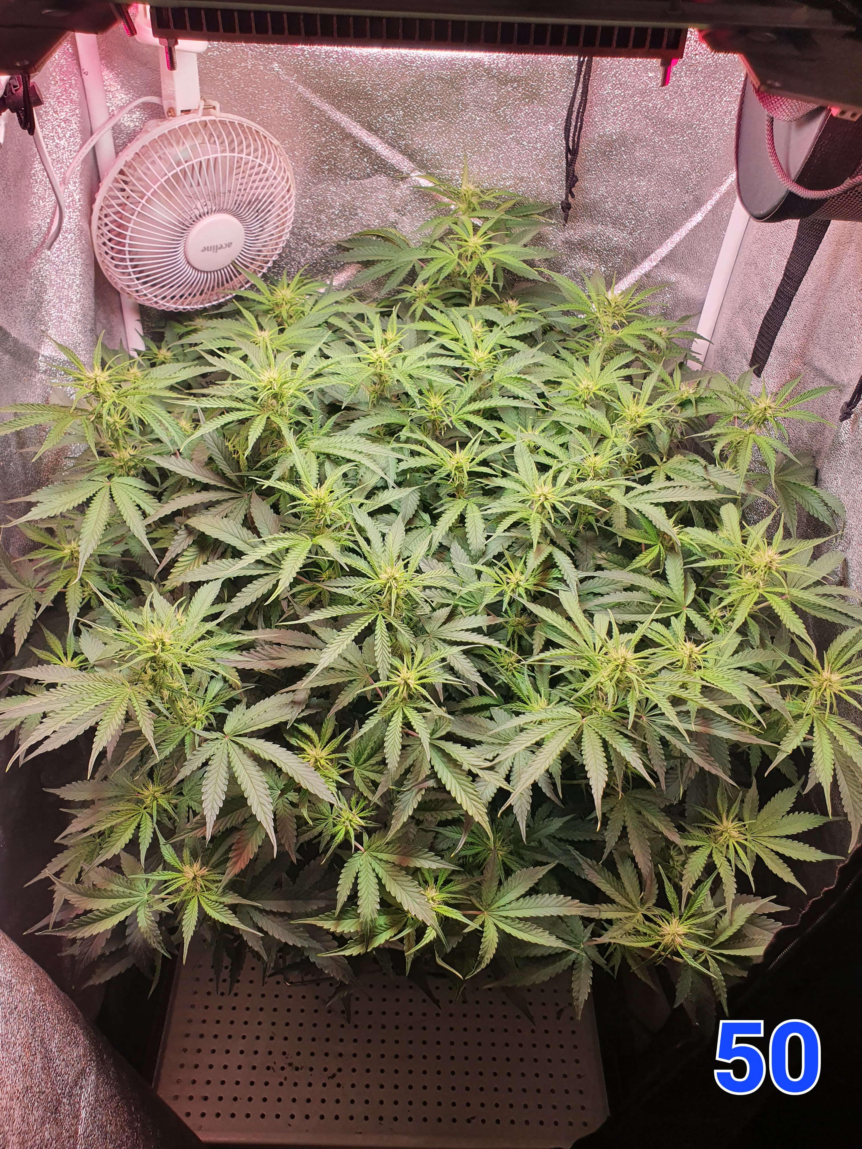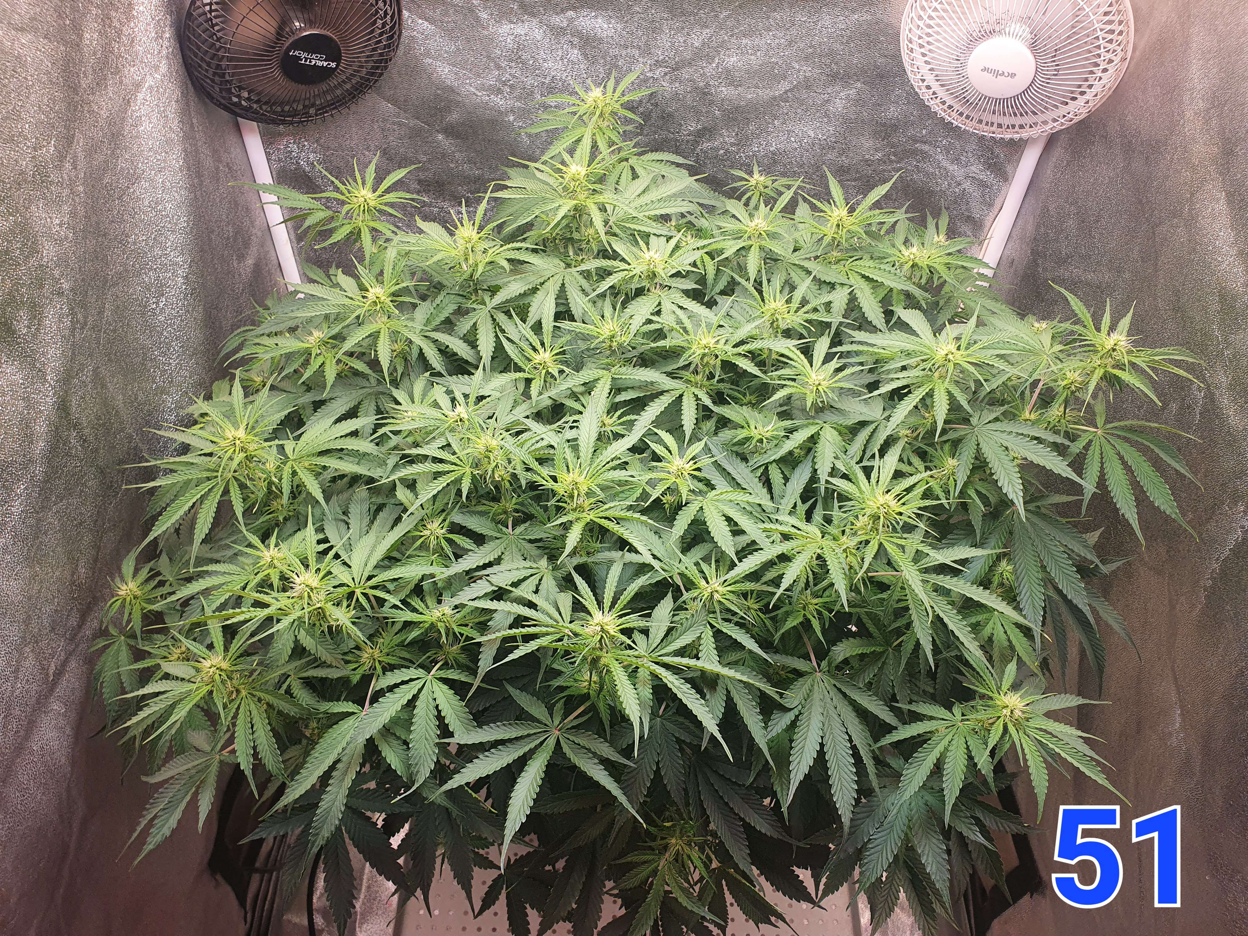 На 50й день было принято решение увеличить жил. площадь куста переместив его в бокс 80х80 и добавив ещё один борд на 240вт выкрученный на 50% (120вт). Над макушками так же 50000 lux ~ 950 ppfd.