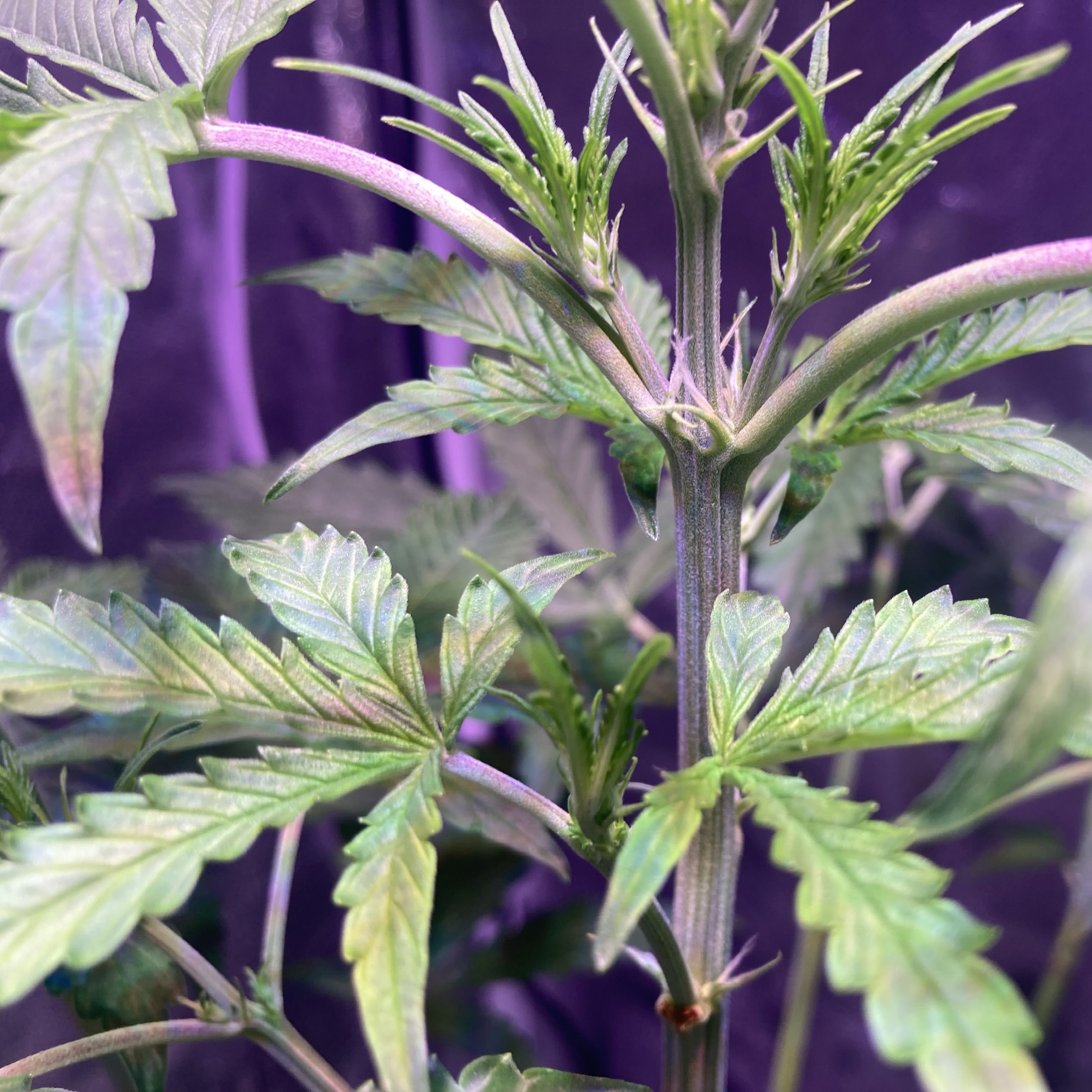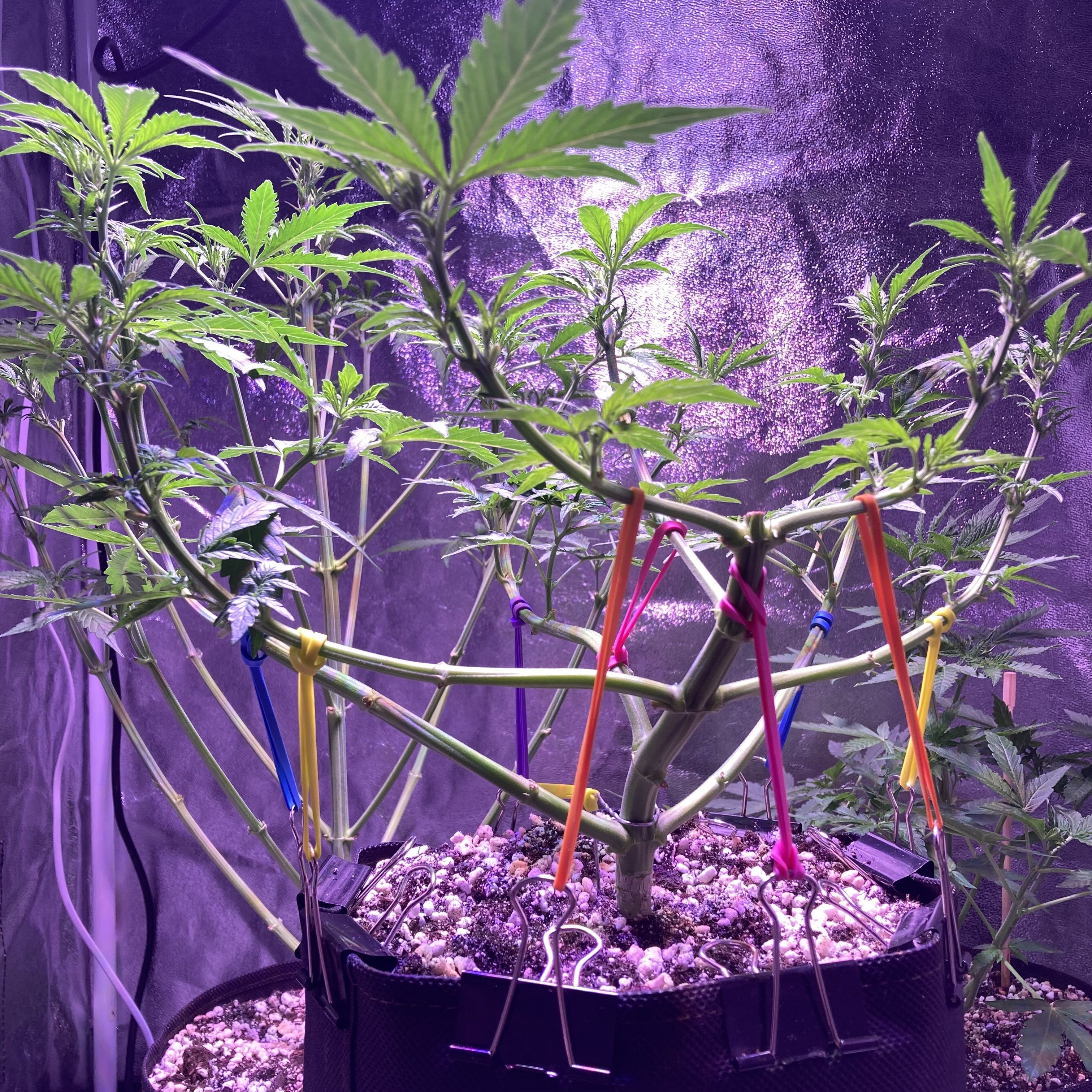 Рок-машина мощно тянет резину, словно пытается сорвать прищепку! Благодаря низкострессовой тренировке, свет ровно расходится по кроне, а побеги друг другу не мешают. Дефолиация убирает тень и добавляет пространства для развития. Запах полевой травы стал насыщенным и едким.