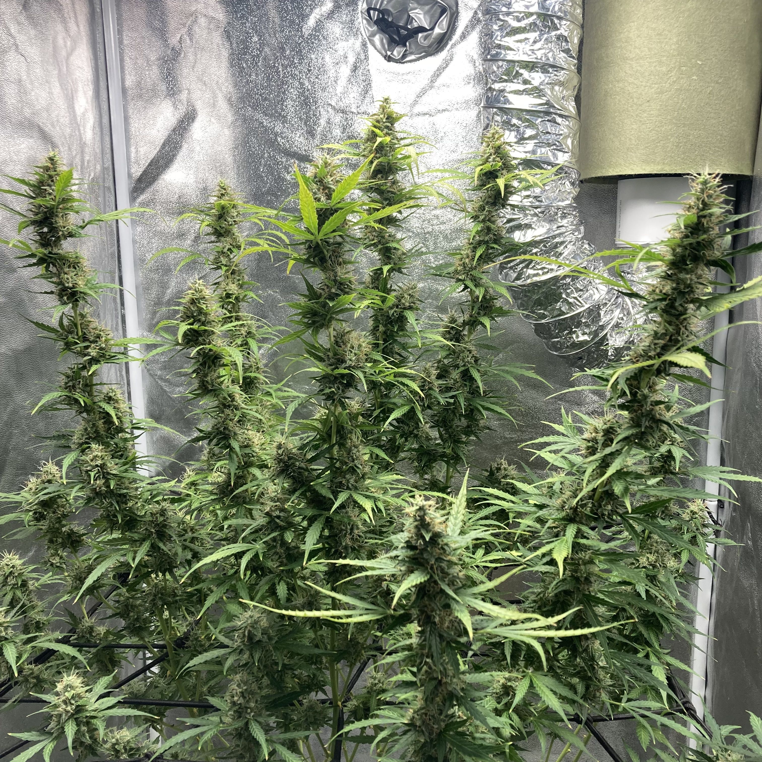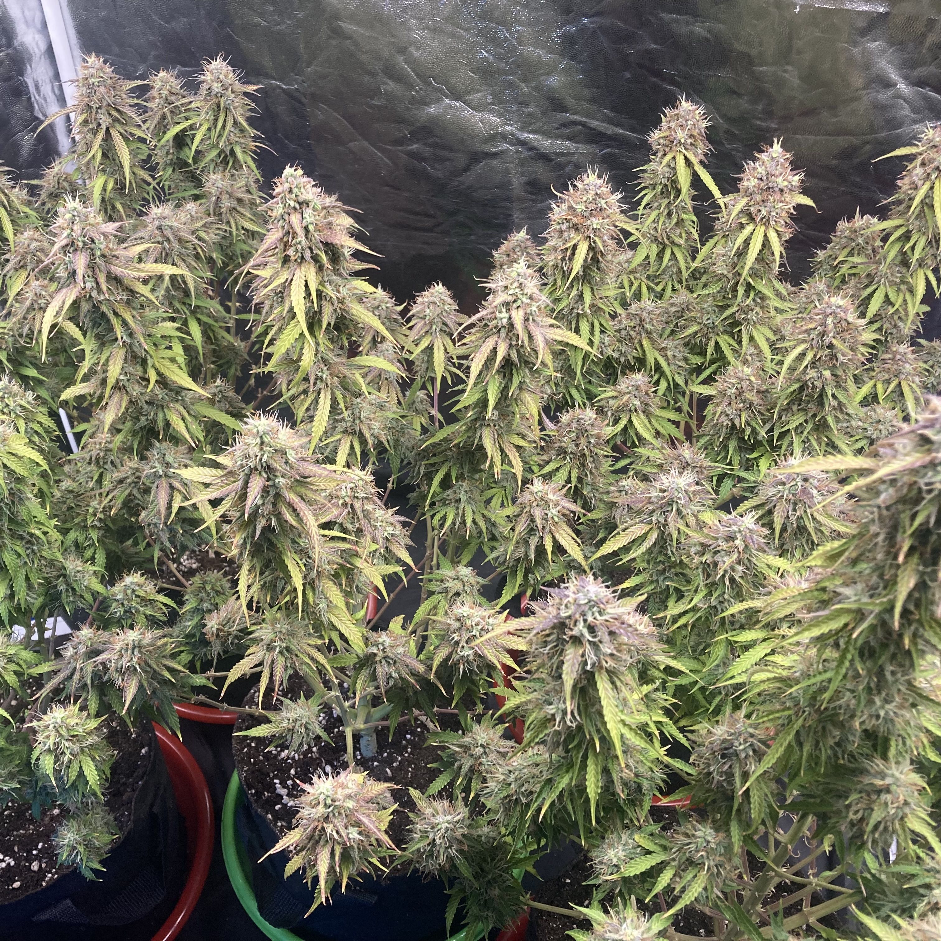 Бонусом вам пара фото с прошлых гровов этого стрейна: на первом шихи рядом с сигами, растила в 20 л. кашпо под ДНаТ (и ДРИ на веге). Снимала по 120 г., но долго: за 120 дней. На другом пять мешков по 10 л. под Q-бордами, 87 дней, по 55 на часах.