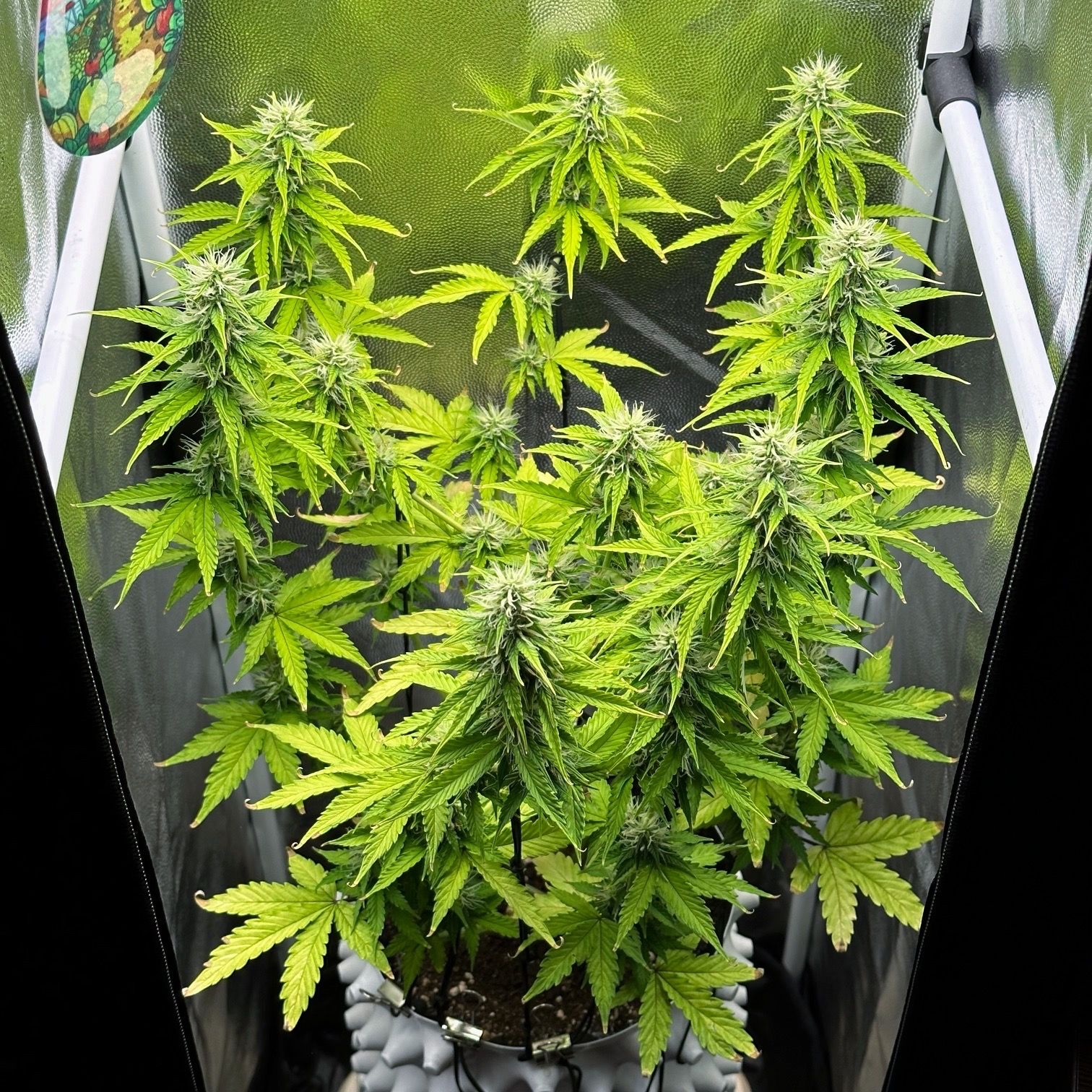 У тебя так из-за поливов случилось. Вот тот веерный лист который завернуло кверху означает что проблемы с поливом были или есть. Нужно проливать чтобы был дренаж, т.к. полив без дренажа это обычно в одно и тоже место вода/кампот идёт, как реки выбрали себе путь например. При поливе с дренажом горшок пропитывается полностью. Второе это быстрое пересыхание грунта при малом объёме грунта. Лучше тогда гроубег завернуть. Я растил в таком аэрпоте, каждый день поливать приходилось. Вес тоже нужно прибавлять, куст же растёт и прибавляет массу. А так доезжай как есть лучше, промывки не нужны, будет хуже. Листья хоть и обесцветились, но функцию свою выполняют, это лёгкое растения, их нужно беречь.