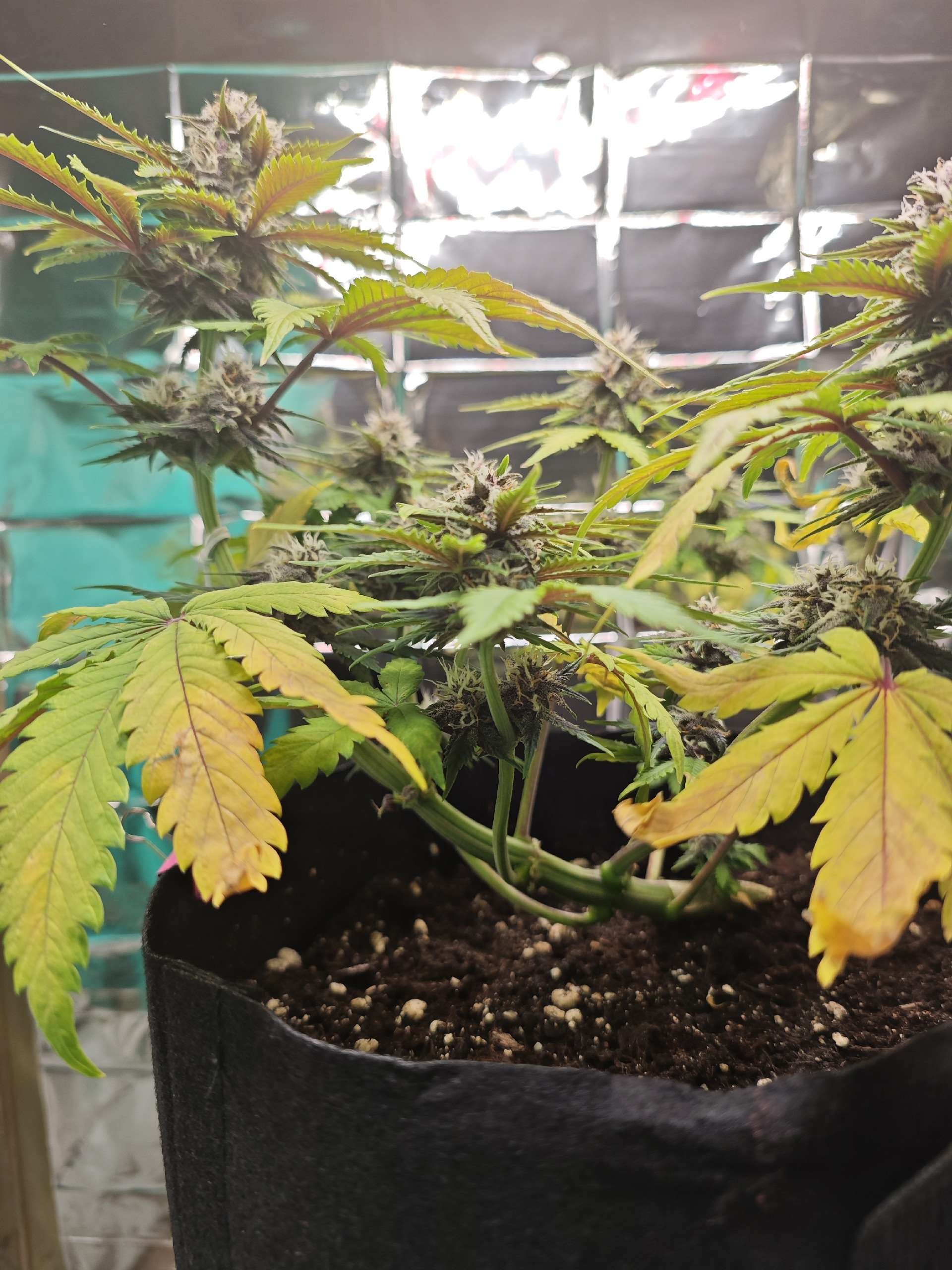 Попробовала включить на досвет китайскую фиолетовую фитолампу, но она греет пипец. Два вента не спасают, одно время держала дверь бокса открытой, пока запах был слабый, чтоб температура не поднималась выше 25. Но как появился запах (а это случилось на этой неделе), решила, что нах это китайское говно, все равно свет не спасет эту умирающую обезьяну. Такие дела. Надеюсь за эту неделю все листья не отвалятся.