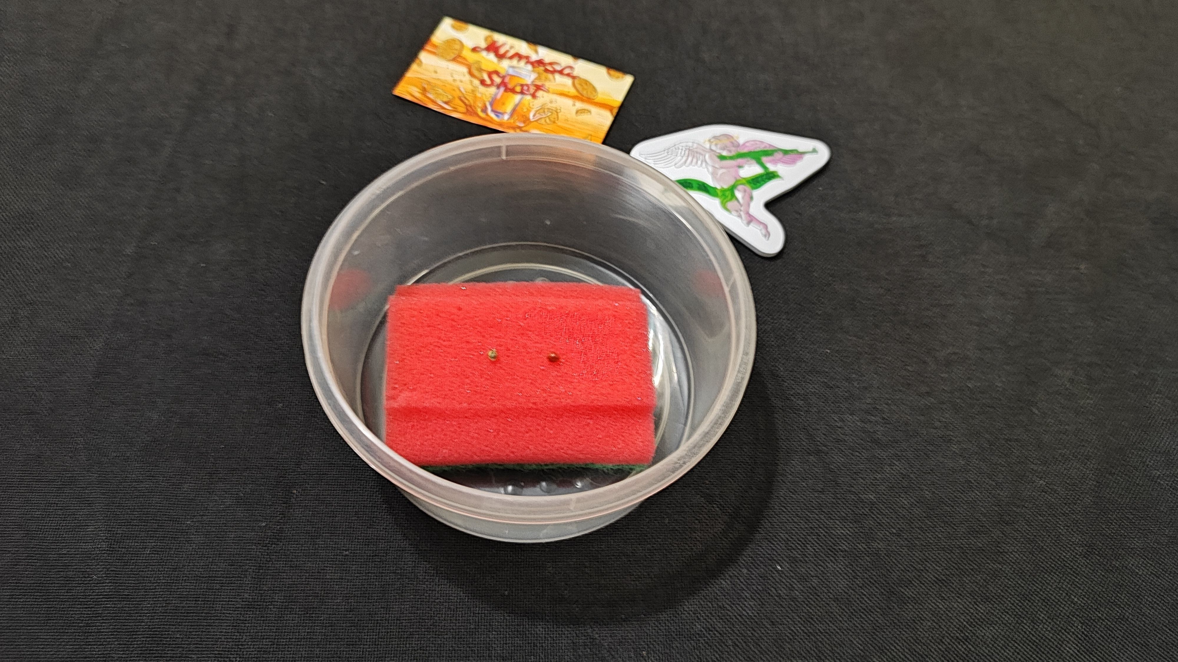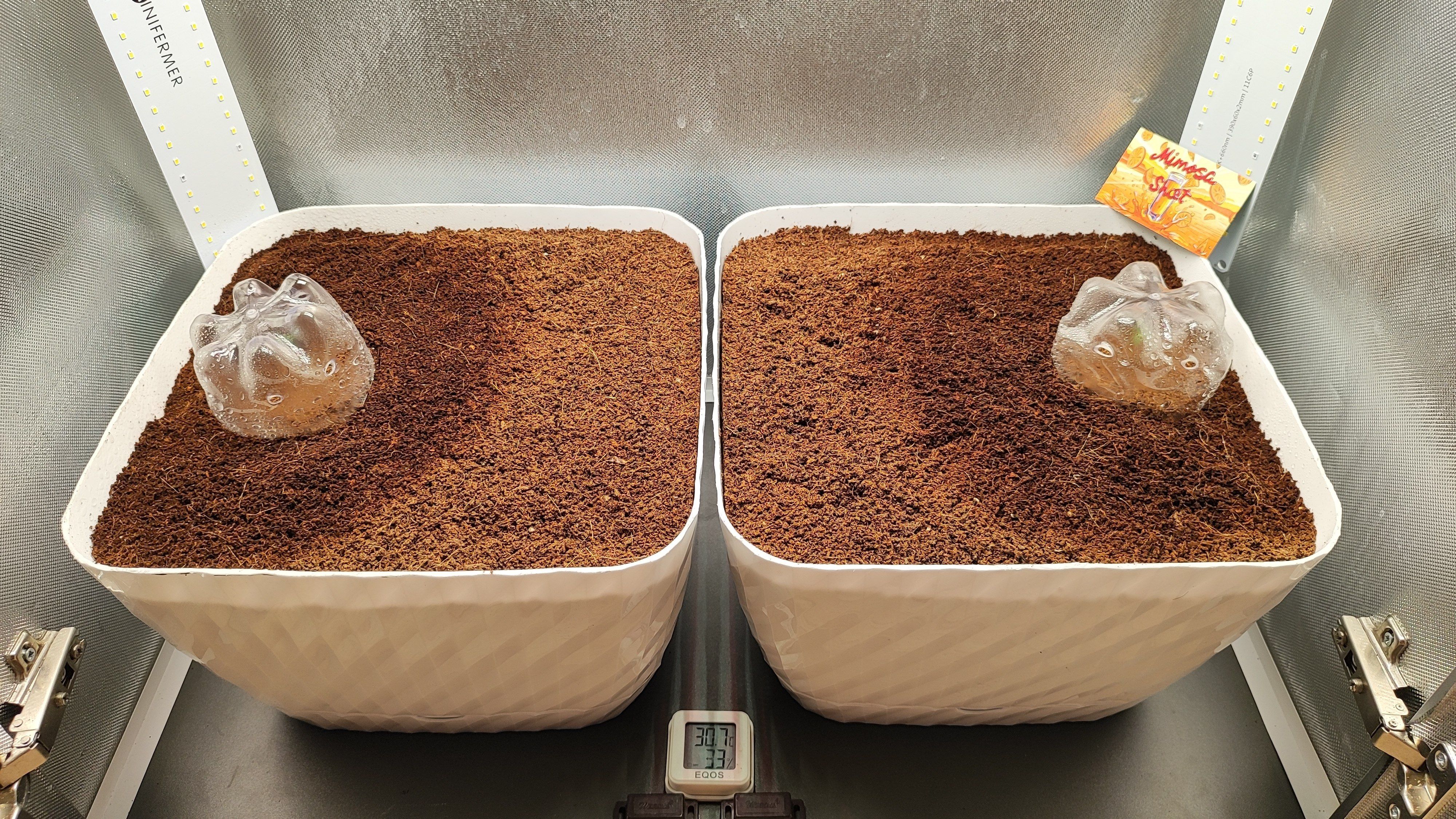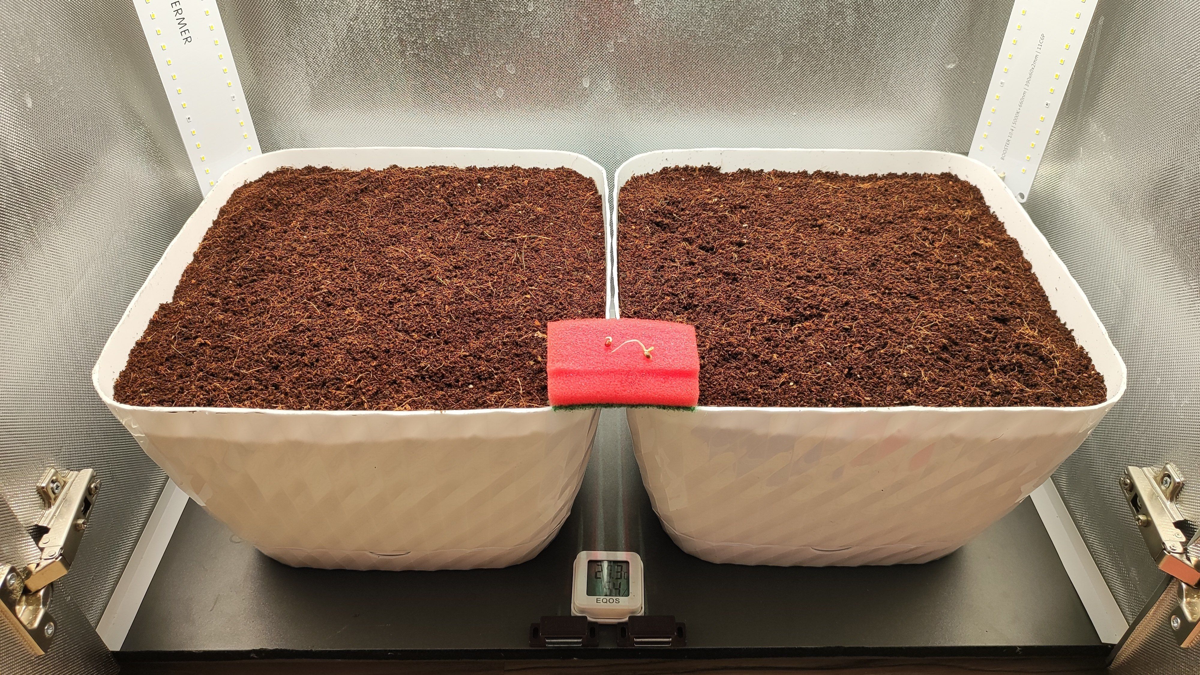 Проращиваю между губок в контейнере, тупо смочил водой из под крана. Горшки 2*15, решил срезать верх, теперь рабочее расстояние от лампы до субстрата 40см. В качестве дренажа нарезал пенопласта, он инертный и не подвержен плесени. Субрат Ugro с микоризой. На оба горшка ушло 1.25кг
