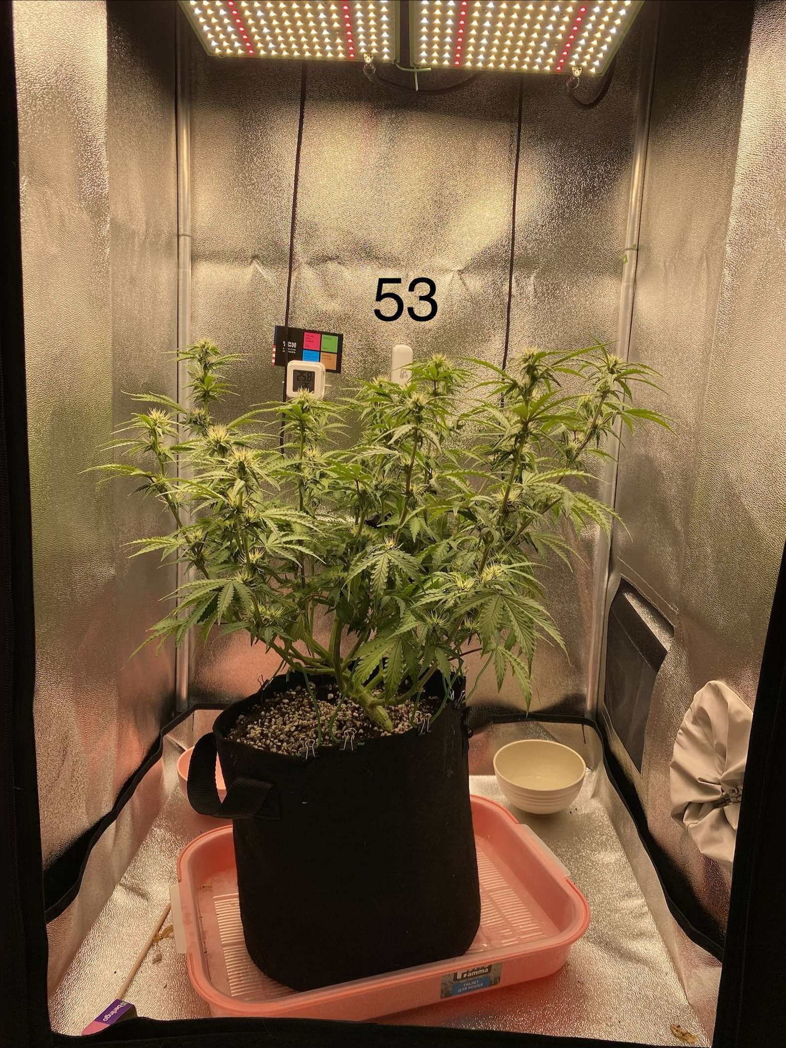 Куст развивается довольно медленно, думаю это совокупность перекорма и количества растущих кол, множества паразитных веток и попкорна. Но всё же заметил появление трихомок на паре соцветий.