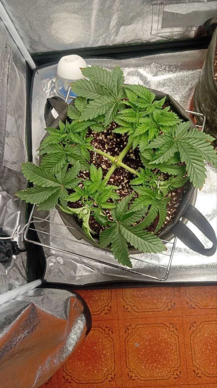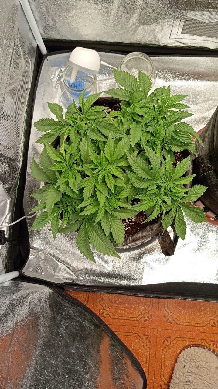 Продолжаем активный рост . Тянуть мейнлинг перестал , теперь все силы в вертикальный рост . Из крупных тренировок осталось только швайзи , но это на первой неделе цвета. Кормлю компотом 2 раза в день по 2л 500ppm 5.8ph Simplex coco a + b. Сейчас подрязаются только те лопухи что колам свет загораживают.