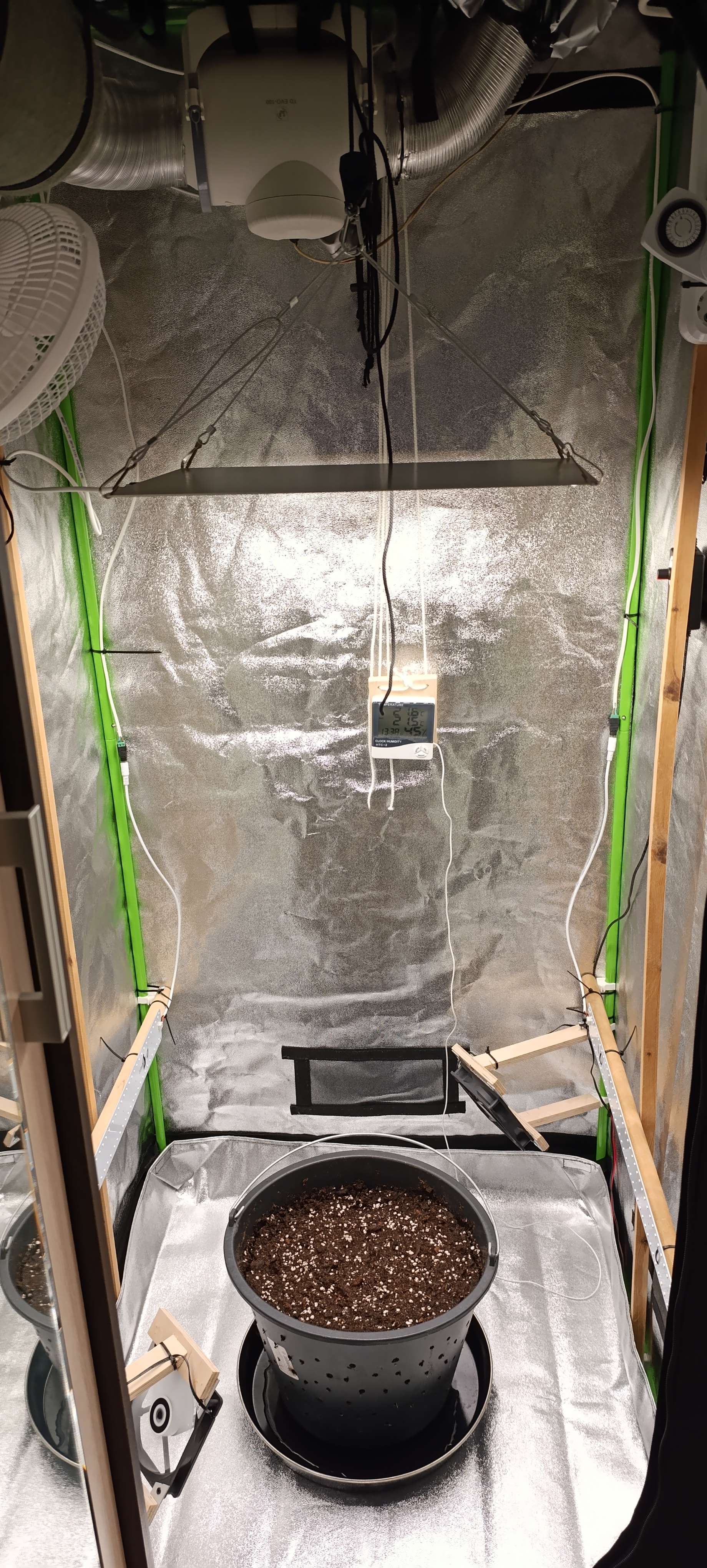 Гроубокс 80х80х180, вытяжка 180 м3/час, фильтр 250 м3/час, приток пассивный, обдув 2 кулера и 1 поворотный вентилятор 20 Вт. Свет – Quantum Board 150Вт/диоды LM301В/полный спектр ИК УФ. А также - боковой досвет 2х25 MiniFermer 2.2.f