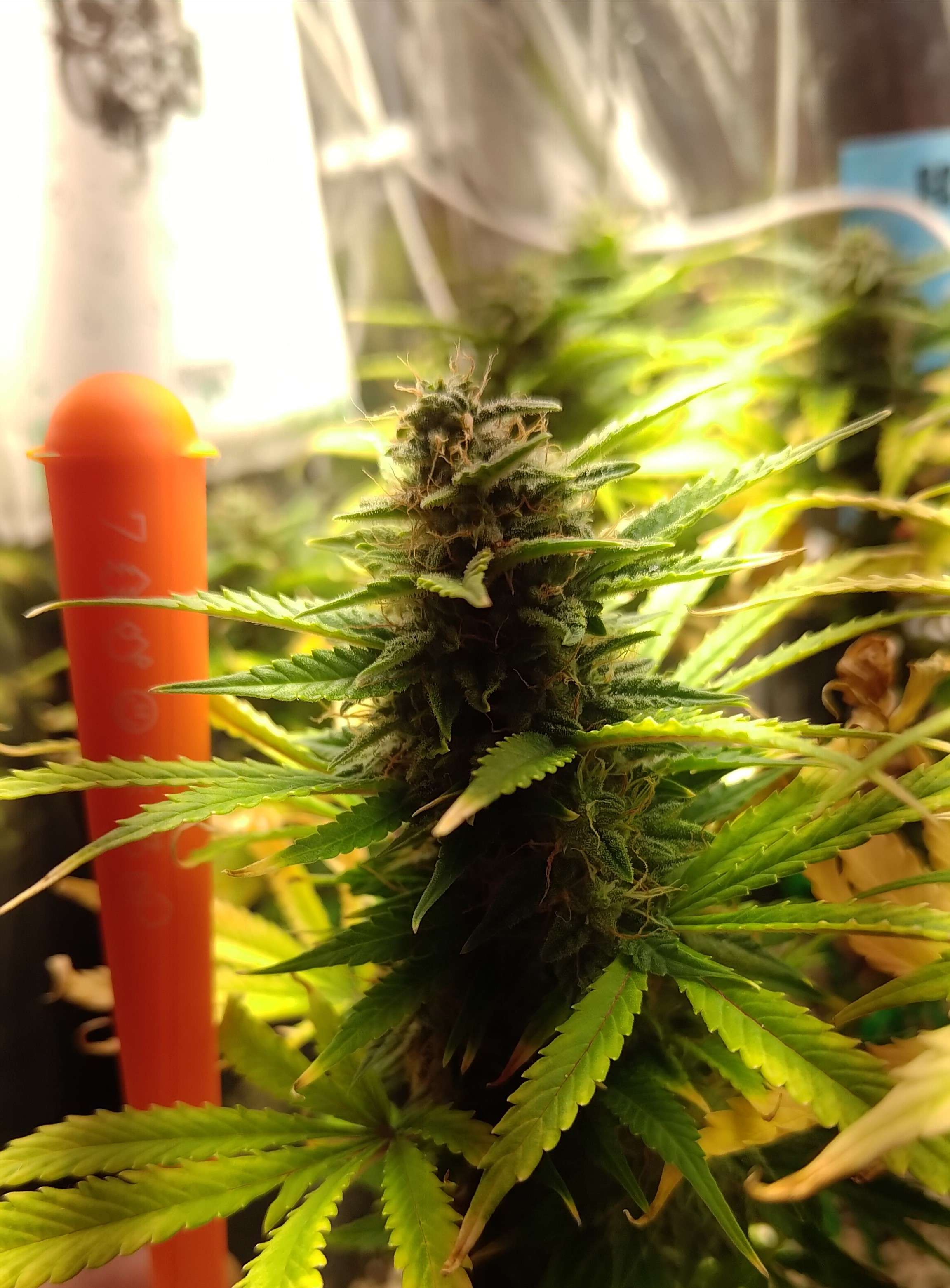 Янтарные трихомы уже появились на всех шишках, много янтаря ждать не будем сорт итак индичный. У Фреи началась засуха, как никак третий день без воды, влажность 39 :bosss