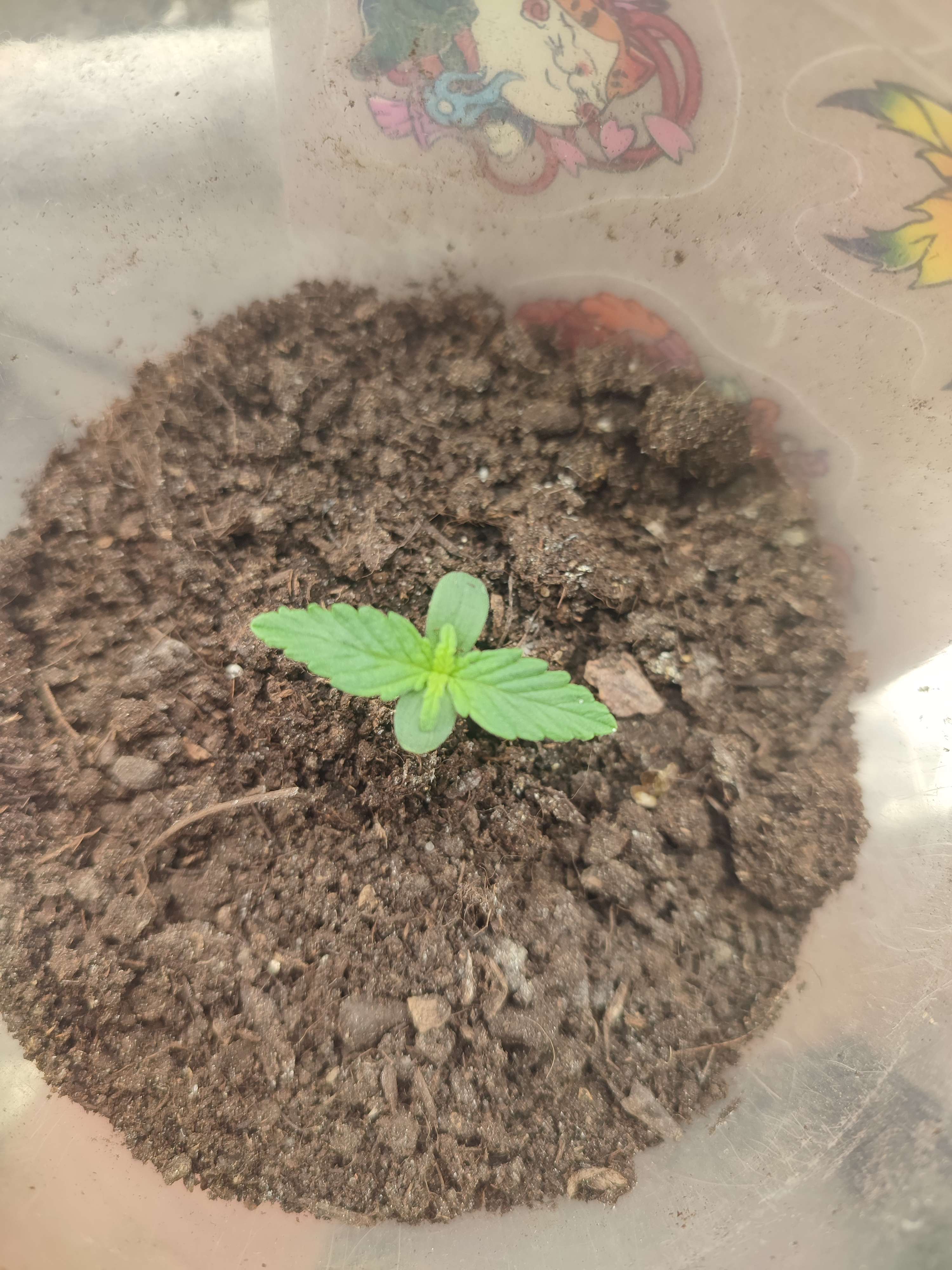Я бы уже пересадил наверн, в горшке сделал бы ямку и из стакана вместе с землей переставил туда, присыпал.