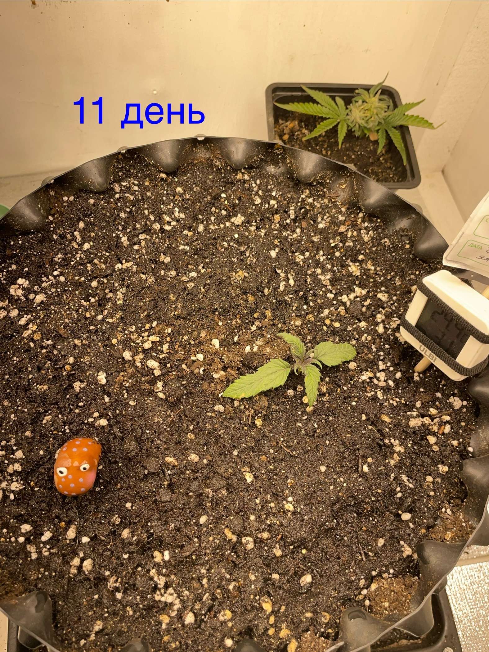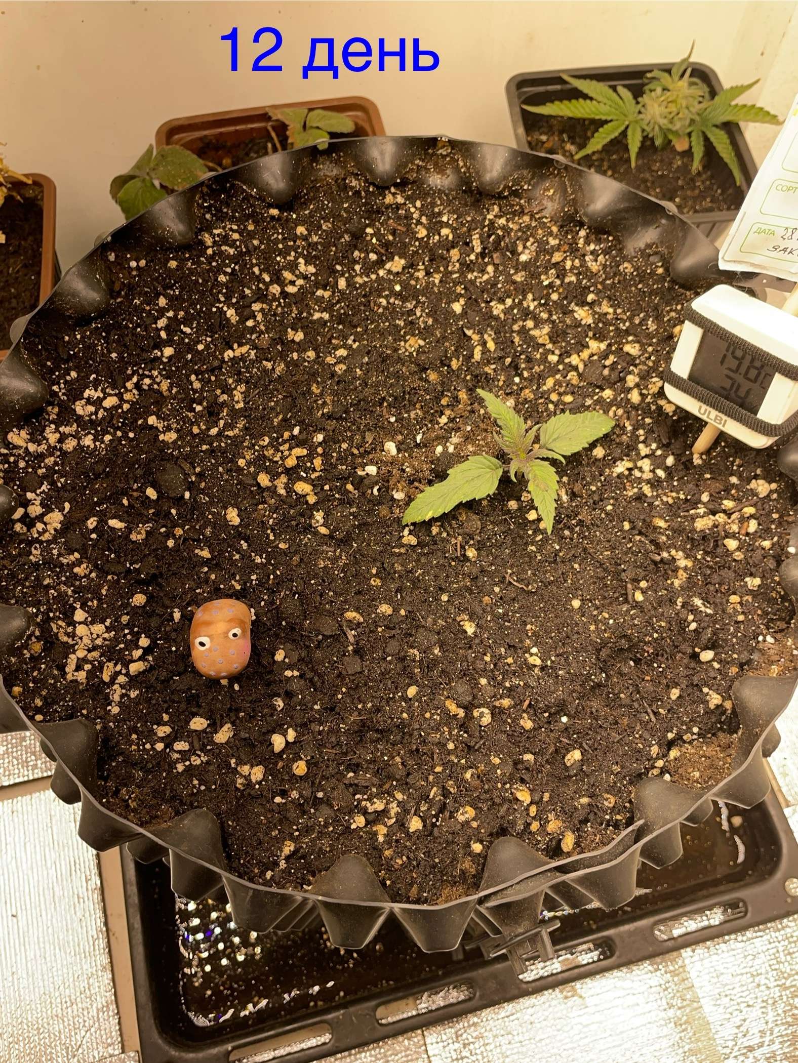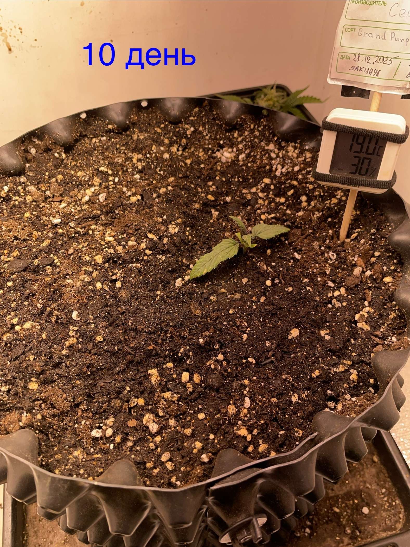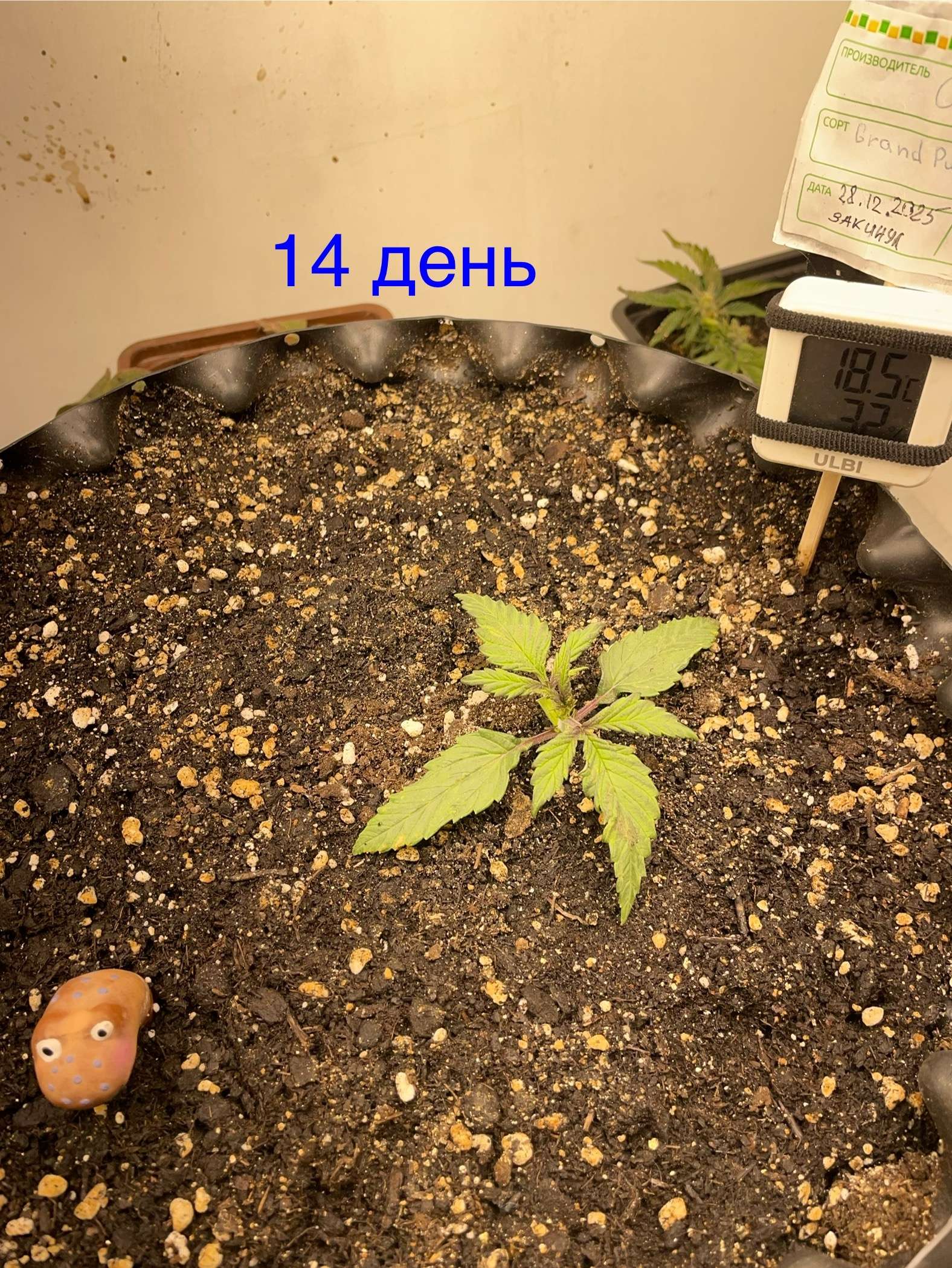 Переставил гигрометр хули он мне там показывает на стенке выше лампы? Ростишка хоть и чуть подмерзла и я чуть пшиколкой на свету дырок прожег, не учел что зимой влага дольше испаряется с поверхности листа, немного притормаживает, но растет….