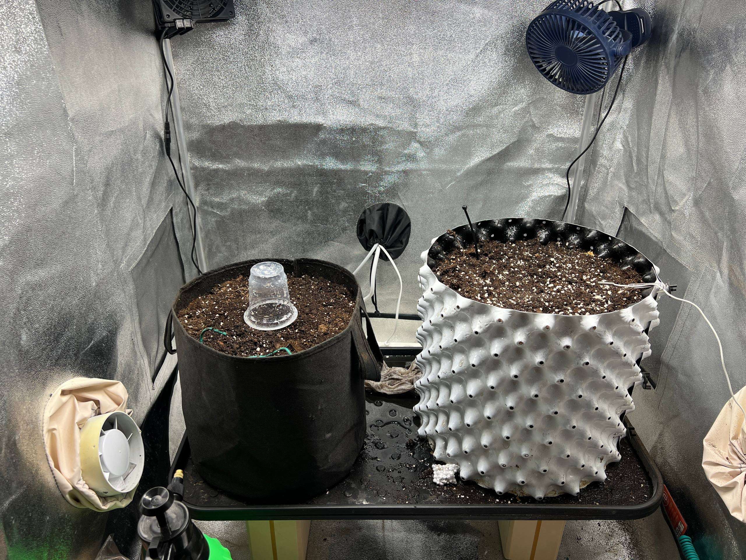 Грунт был процентов на 70 юзанный с прошлого грова (хз на сколько это плохо будет), так что немного пролил водичкой с добавлением Про рутс, чутка Калмага и Топмакса. Сверху попшикатый стаканчик с дырками.