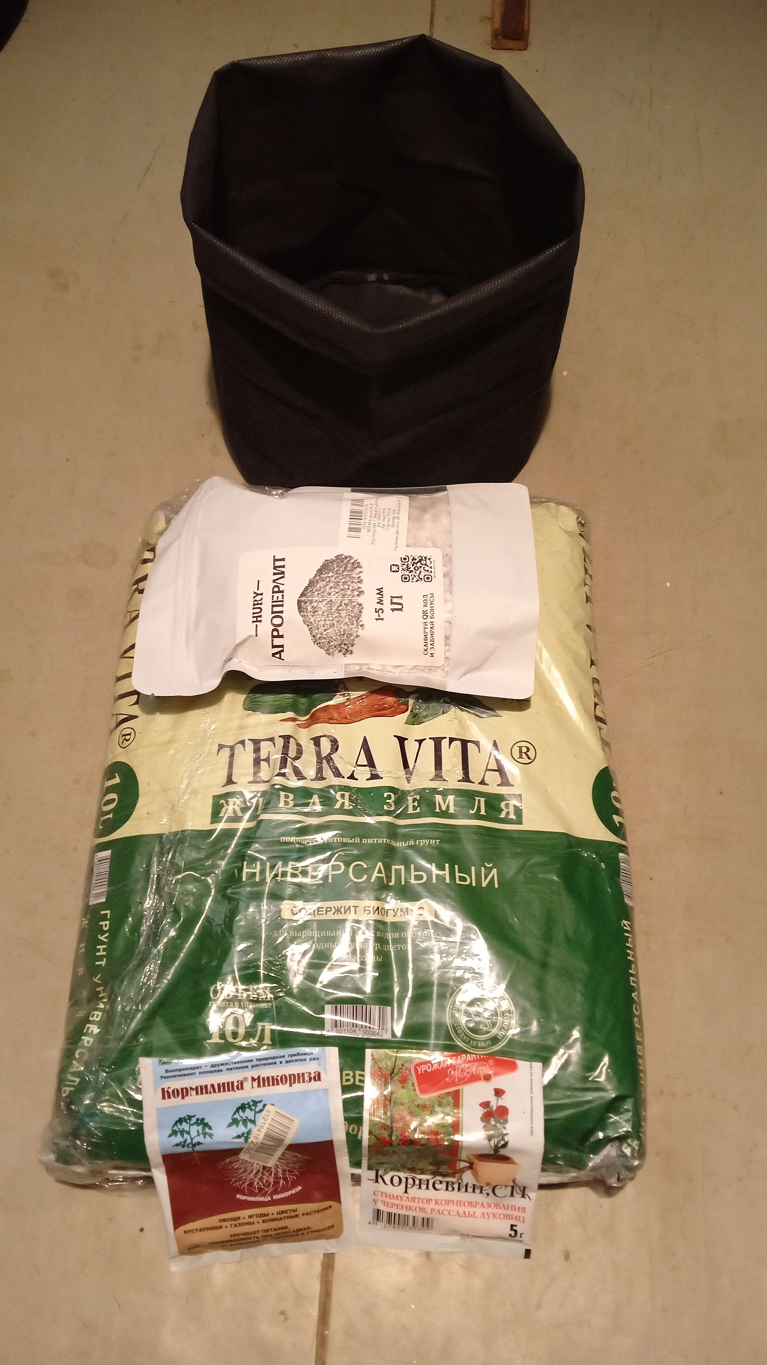 На фото предельно ясно. Такой будет замес почвосмеси... Горшок тканевый 10 литров. Пару раз подверну сверху, где-то 8-9 будет. Пару слоёв просыплю микоризы по одной-две чайной ложки... Корневин,при поливе один раз добавлю 0.25% от рекомендаций. Хватит. Нормально будет. Грунт хороший, проверено!!!
