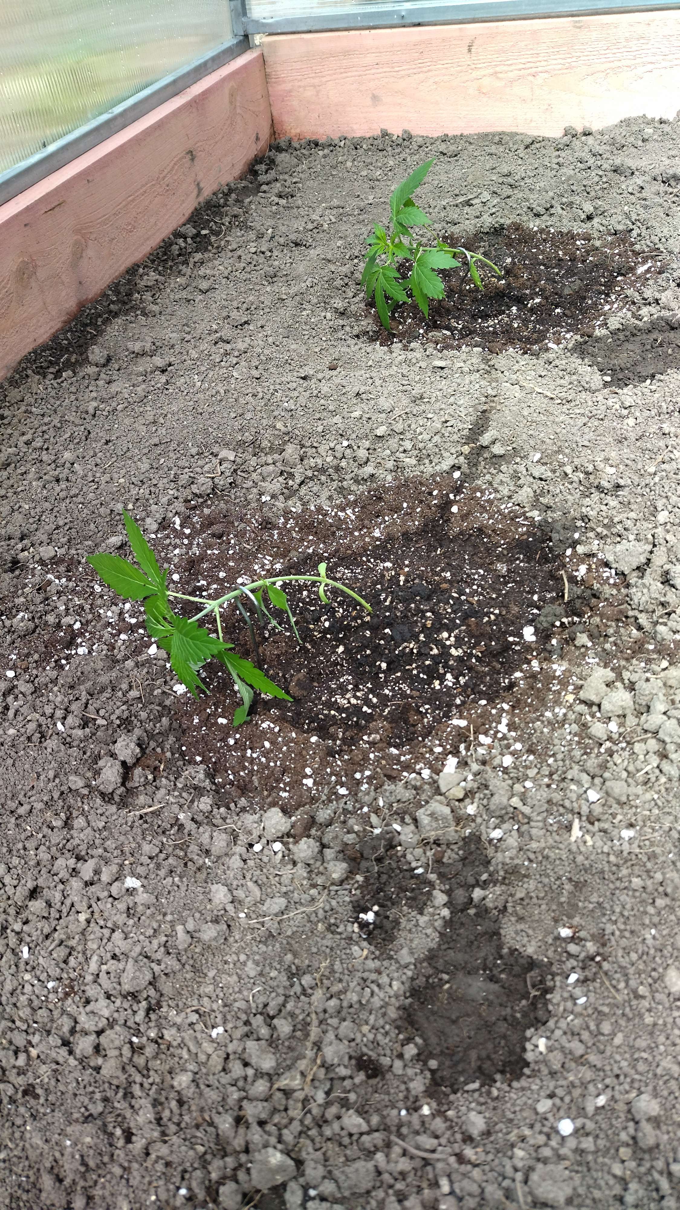 Гориллы мои сегодня переехали в теплицу на ПМЖ. Дневная температура нормальная, а по ночам 10 обещают. Будем закаляться. Заехали в готовые лунки. Пару дней не поливал, что б пересадить и подогнуть малость. Немного нагнул, а то поздно будет. Пролил сразу составом для грунта и корней. Пересадил без заморочек, стресса минимум. Смена места жительства, тренировка, температурный всё равно стресс. Глянем как очухаются. Вечерком сбрызну эпином. Ну и подгибать буду по-тихому.