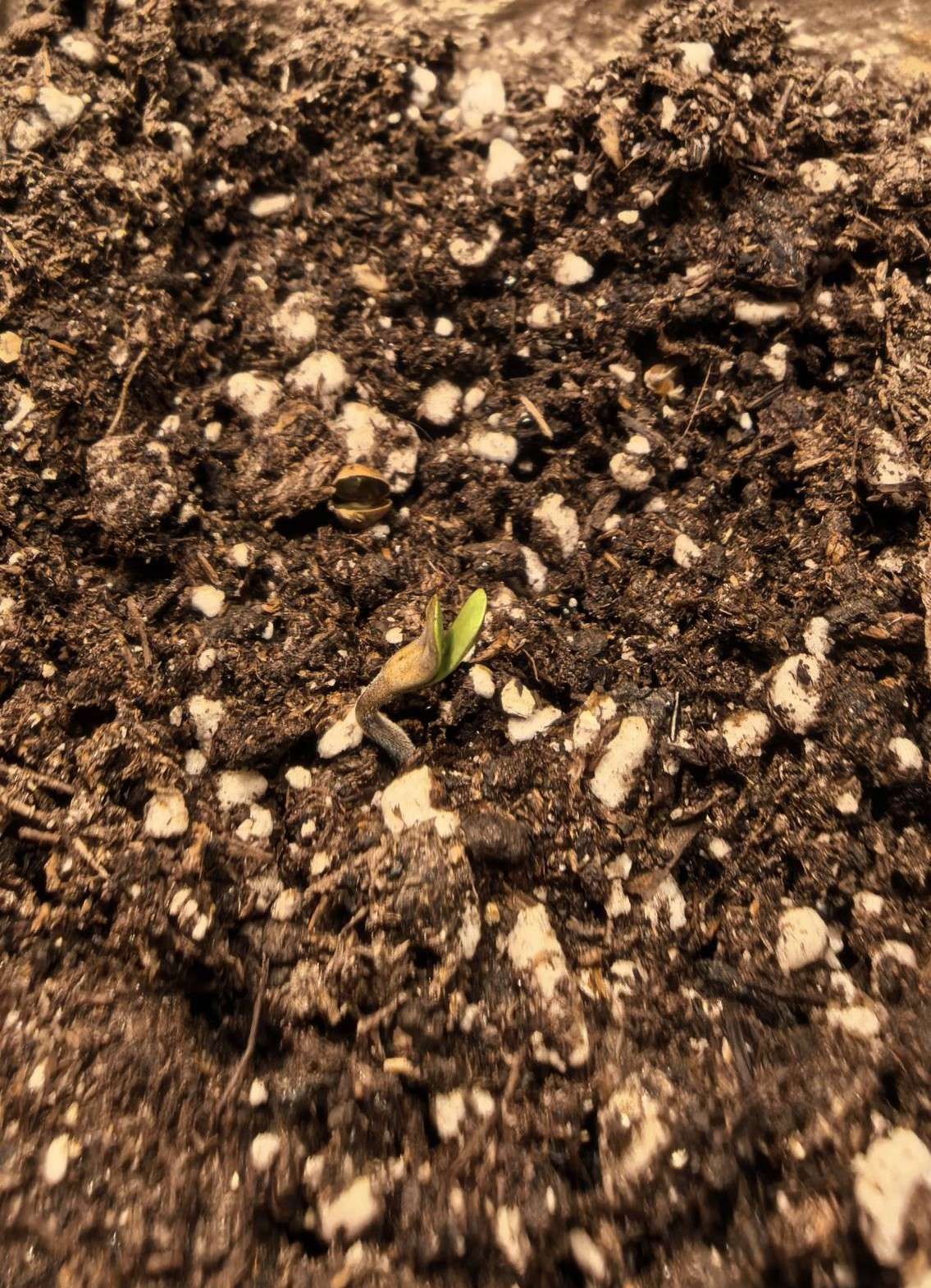 Семка была замочена в стаканчике воды с перекисью на сутки и потом переехала в ватные диски. Прорастала 2 дня. Потом переезд в стаканчик с грунтом, и через 2 дня показалась каска. Пришлось немного помочь растишке избавится от остатков каски. В целом старт был не быстрый. Но, это у меня частое явление - "цыплят по осени считают".